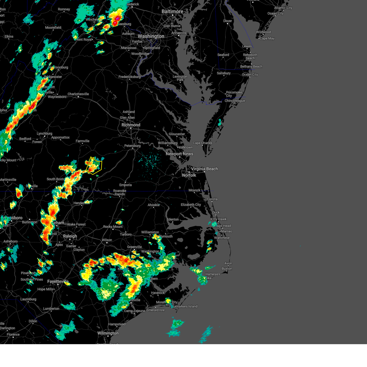 At 519 pm edt, severe thunderstorms were located along a line extending from near blackstone to 6 miles north of south hill to 9 miles north of norlina, moving east at 20 mph (radar indicated). Hazards include 60 mph wind gusts and quarter size hail. Hail damage to vehicles is expected. expect wind damage to roofs, siding, and trees. locations impacted include, south hill, blackstone, kenbridge, la crosse, bacons fork, lafoon corner, irby, beechwood, bracey, murdocks, john h kerr dam and john h kerr reservoir. precautionary/preparedness actions, a tornado watch remains in effect for the warned area. tornadoes can develop quickly from severe thunderstorms. although a tornado is not immediately likely, if one is spotted act quickly and move to a place of safety inside a sturdy structure, such as a basement or small interior room. for your protection move to an interior room on the lowest floor of a building. please send your reports of hail and or wind damage, including trees or large limbs downed, by calling noaa`s national weather service in wakefield at , 7 5 7, 8 9 9, 2 4 1 5. A tornado watch remains in effect until 1000 pm edt for south central virginia.