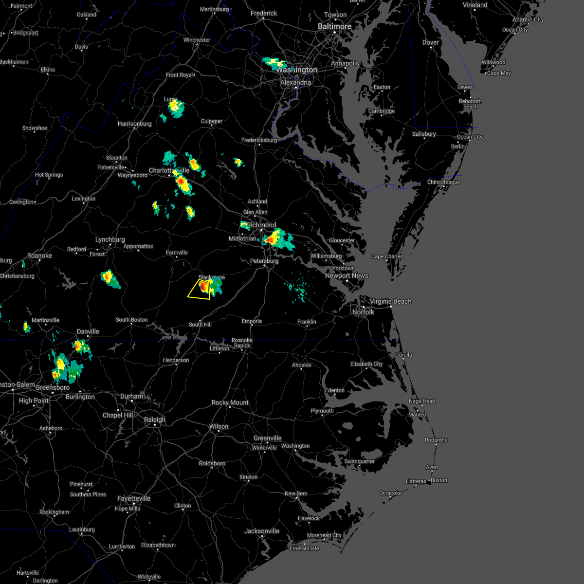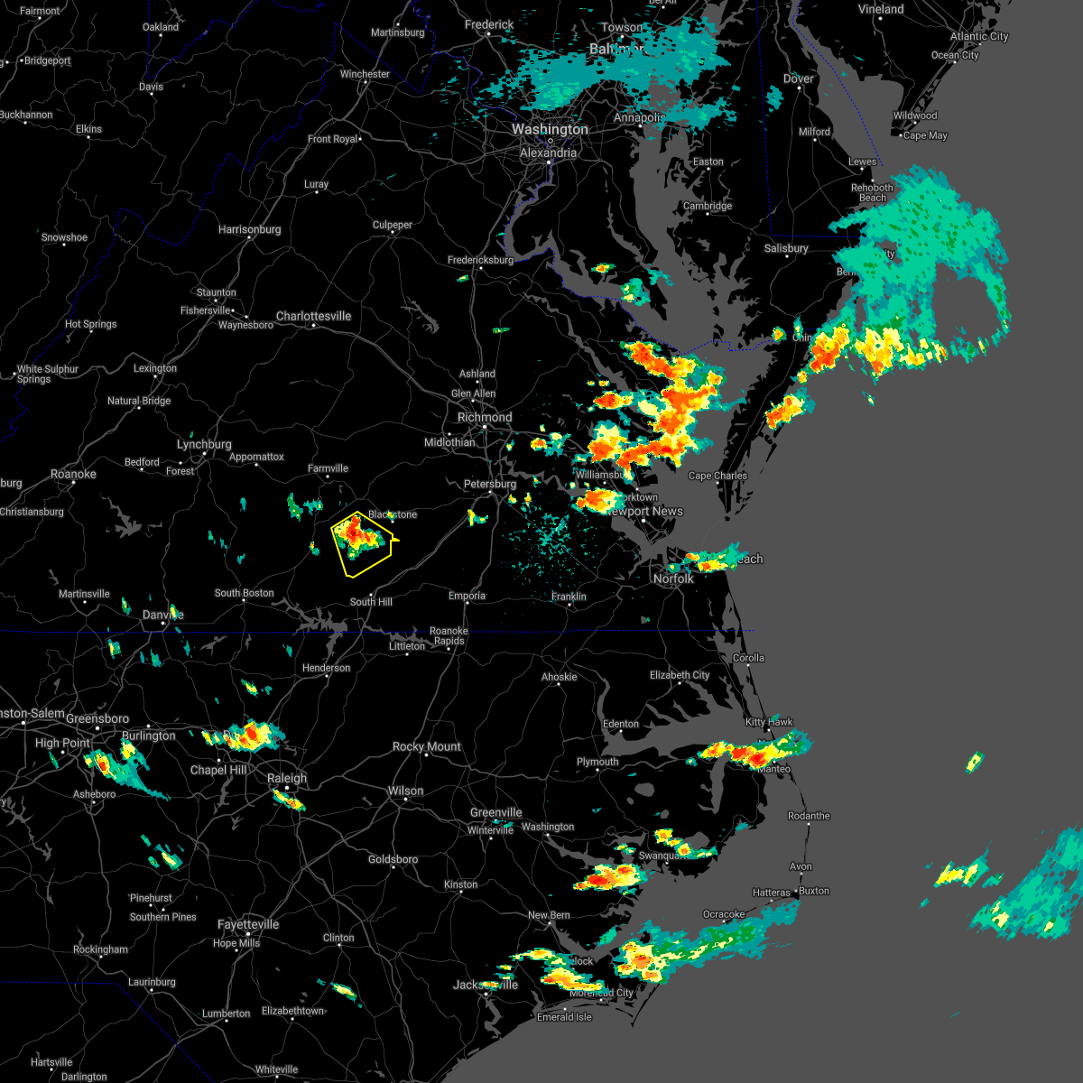 At 649 pm edt, a severe thunderstorm was located near blackstone, moving southeast at 20 mph (radar indicated). Hazards include 60 mph wind gusts and quarter size hail. Minor damage to vehicles is possible. expect wind damage to trees and powerlines. this severe storm will be near, blackstone around 655 pm edt. Other locations impacted by this severe thunderstorm include lafoon corner, irby, dominy corner, murdocks, forkland, blackstone airport, and the falls.