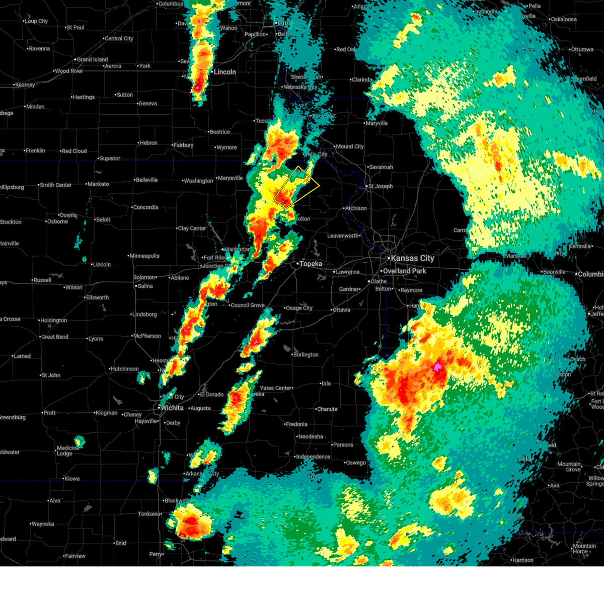 At 742 am cdt, a severe thunderstorm was located near netawaka, moving east at 55 mph (trained weather spotters. tree damage and winds in excess of 70 mph have been reported with the storms). Hazards include 70 mph wind gusts and ping pong ball size hail. People and animals outdoors will be injured. expect hail damage to roofs, siding, windows, and vehicles. expect considerable tree damage. wind damage is also likely to mobile homes, roofs, and outbuildings. locations impacted include, holton, seneca, horton, wetmore, whiting, circleville, corning, netawaka, soldier, goff, powhattan, kickapoo reservation and woodlawn. thunderstorm damage threat, considerable hail threat, radar indicated max hail size, 1. 50 in wind threat, radar indicated max wind gust, 70 mph.