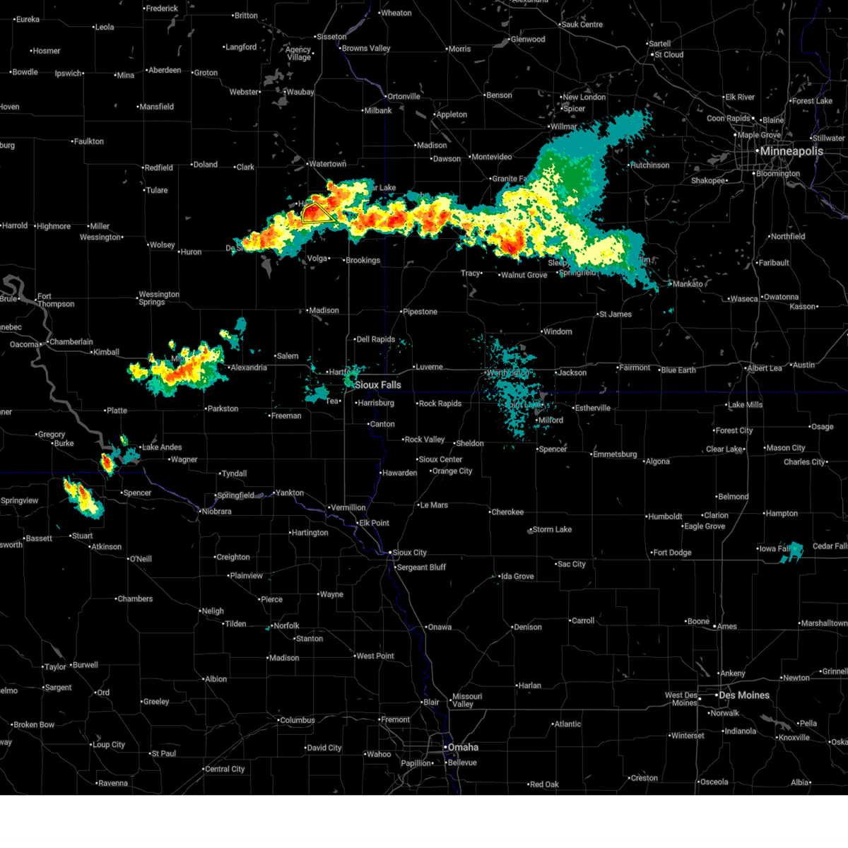 At 625 pm cdt, severe thunderstorms were located along a line extending from near lake poinsett to near nunda to near winfred, moving southeast at 40 mph (radar indicated). Hazards include 60 mph wind gusts and half dollar size hail. Hail damage to vehicles is expected. expect wind damage to roofs, siding and trees. severe thunderstorms will be near, sinai around 630 pm cdt. madison, nunda and oakwood state park around 635 pm cdt. lake herman state park and bruce around 640 pm cdt. volga, wentworth and orland around 645 pm cdt. brookings, colman and white around 655 pm cdt. flandreau, aurora, egan, trent and chester around 700 pm cdt. Other locations impacted by these severe thunderstorms include bushnell.