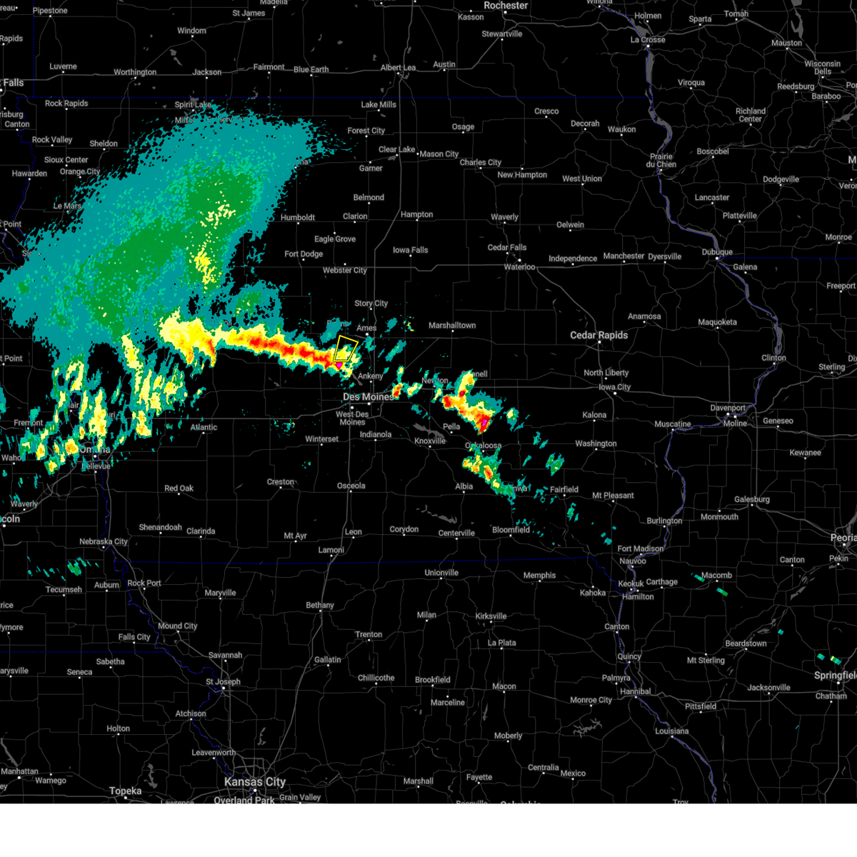 At 440 pm cdt, severe thunderstorms were located along a line extending from 10 miles northwest of boone to near nevada to near colfax, moving northeast at 70 mph (trained weather spotters. these storms have a history of producing wind gusts from 60 to 70 mph with numerous trees down and minor structural damage). Hazards include 70 mph wind gusts. Expect considerable tree damage. damage is likely to mobile homes, roofs, and outbuildings. locations impacted include, ames, ankeny, newton, altoona, boone, nevada, jefferson, bondurant, story city, huxley, madrid, mitchellville, colfax, ogden, prairie city, slater, state center, roland, baxter and gilbert. this includes the following highways, interstate 35 between mile markers 91 and 126. interstate 80 between mile markers 141 and 164. A tornado watch remains in effect until 700 pm cdt for central and west central iowa.