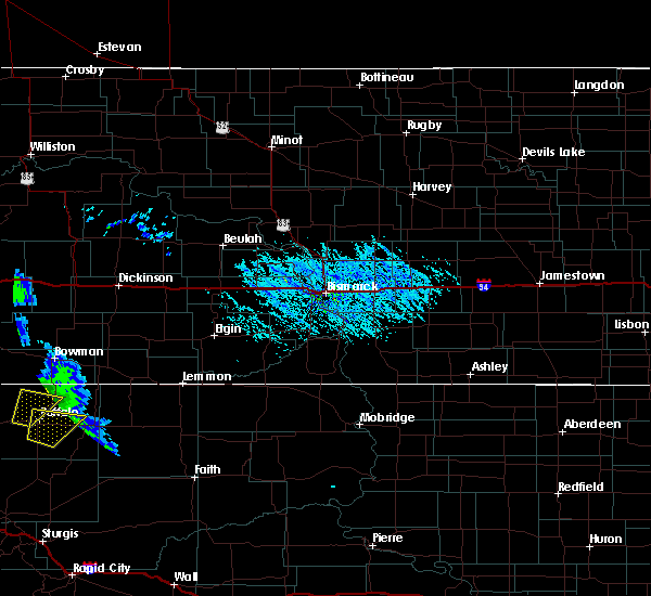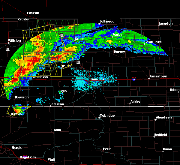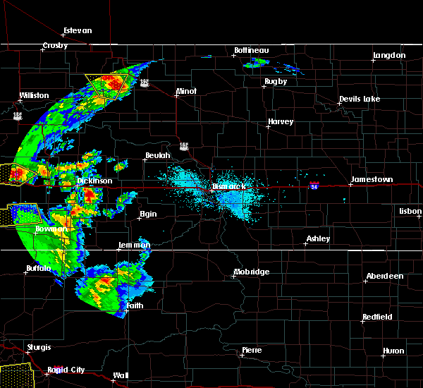 At 641 pm mdt, severe thunderstorms were located along a line extending from 13 miles southwest of new england to 9 miles north of mud buttes, moving southeast at 40 mph (radar indicated). Hazards include 60 mph wind gusts and half dollar size hail. Hail damage to vehicles is expected. expect wind damage to roofs, siding, and trees. these severe thunderstorms will remain over mainly rural areas of bowman, slope and western adams counties, including the following locations, sunset butte, bowman haley dam, bucyrus, griffin, buffalo springs, pretty butte and gascoyne. hail threat, radar indicated max hail size, 1. 25 in wind threat, radar indicated max wind gust, 60 mph.