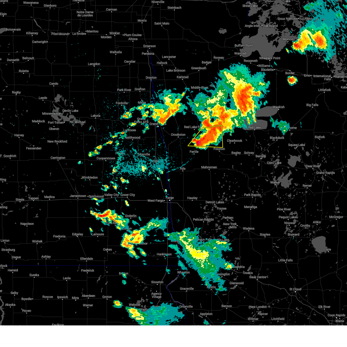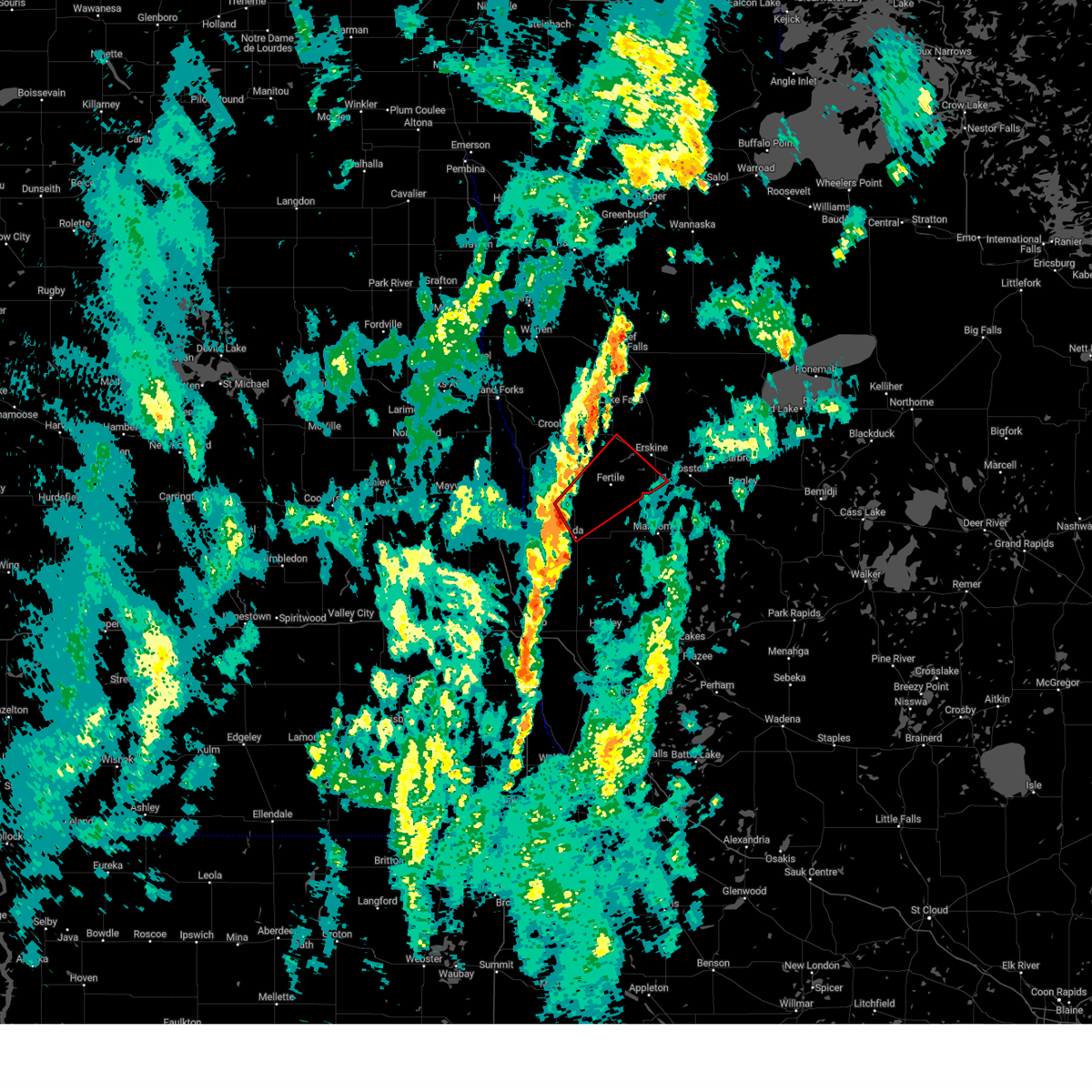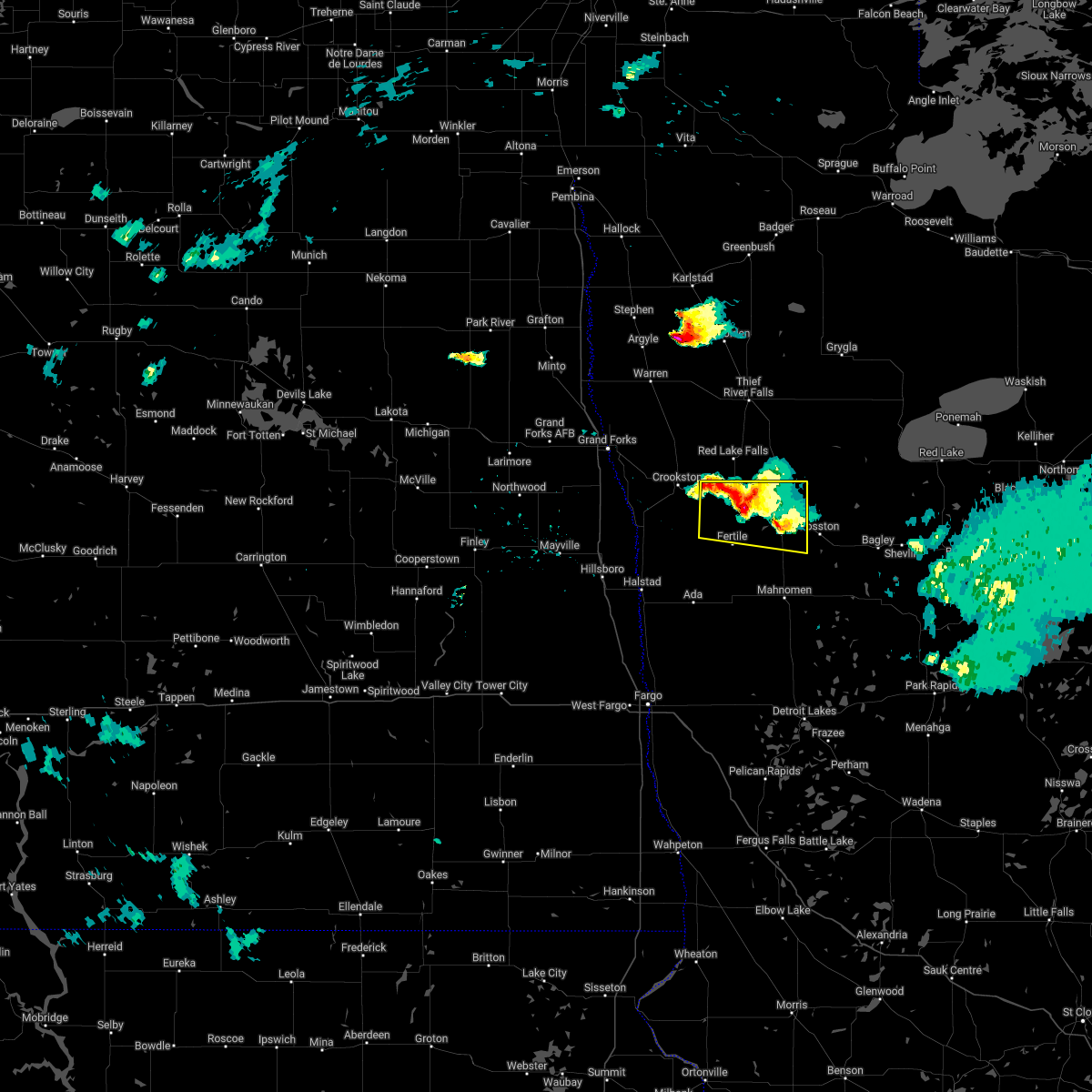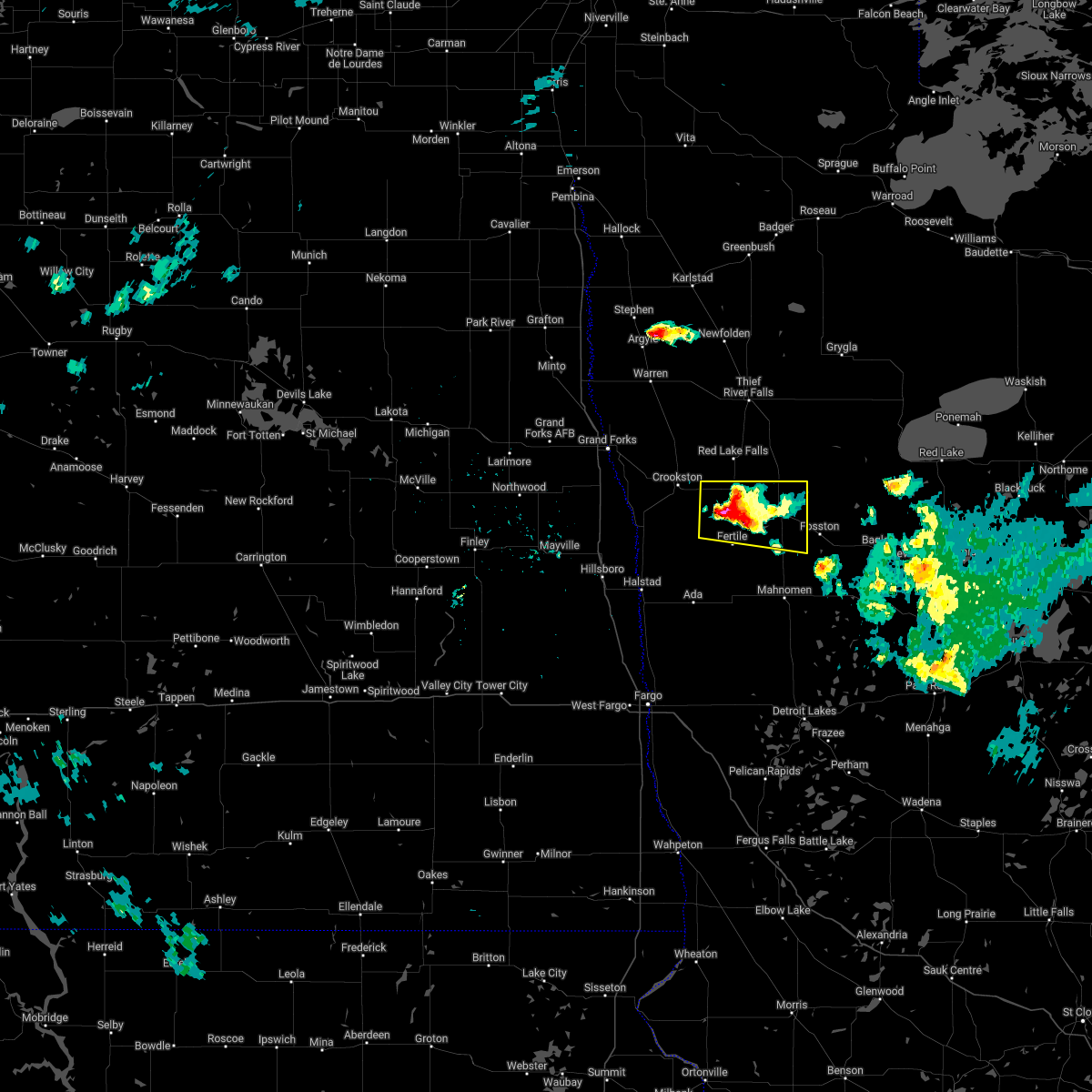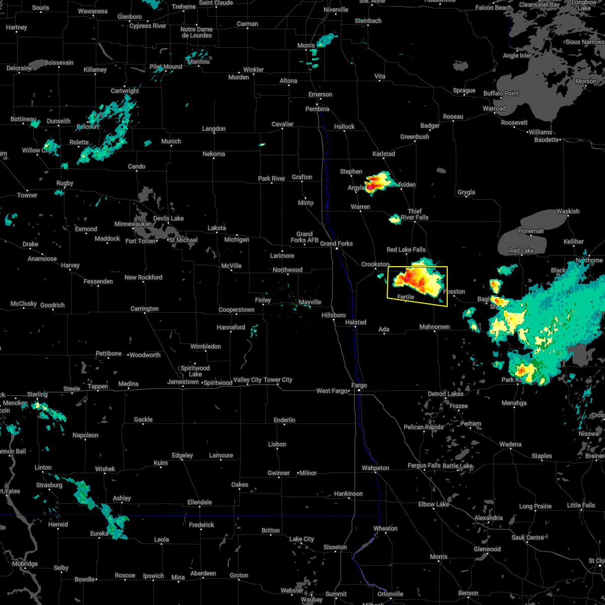 At 223 am cdt, severe thunderstorms were located along a line extending from near huot to near fertile, moving northeast at 60 mph (public). Hazards include 70 mph wind gusts. Expect considerable tree damage. damage is likely to mobile homes, roofs, and outbuildings. these severe storms will be near, maple bay, gentilly, and rindal around 225 am cdt. red lake falls, erskine, and winger around 230 am cdt. mcintosh, st. hilaire, and terrebonne around 235 am cdt. plummer, brooks, and hazel around 240 am cdt. oklee around 245 am cdt. Other locations impacted by these severe thunderstorms include thief river falls airport.