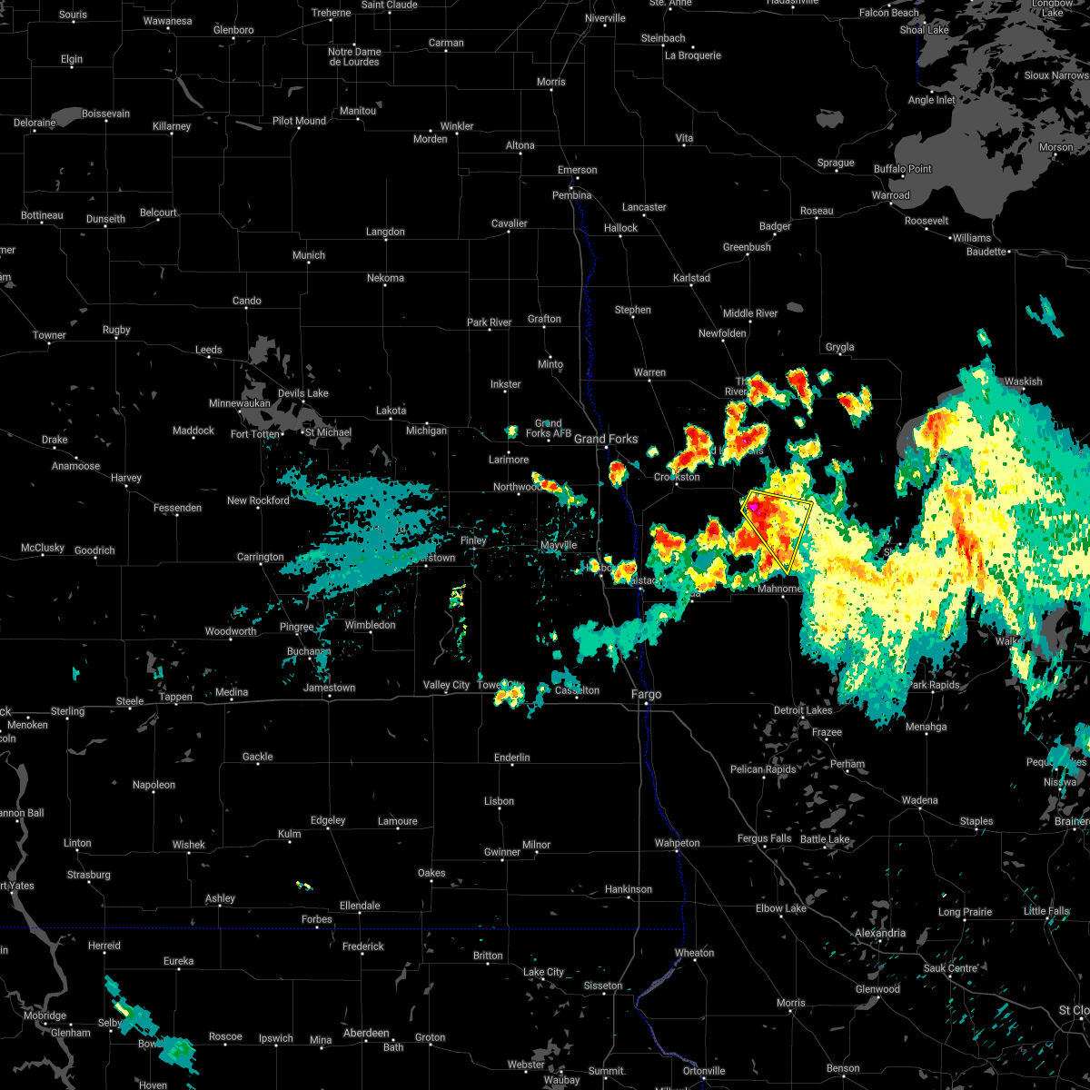 At 813 am cdt, severe thunderstorms were located along a line extending from near park river to near tabor to greenview, moving northeast at 45 mph. these are very dangerous storms (winds of 70 to 80 mph winds and have been reported). Hazards include 80 mph wind gusts and quarter size hail. Flying debris will be dangerous to those caught without shelter. mobile homes will be heavily damaged. expect considerable damage to roofs, windows, and vehicles. extensive tree damage and power outages are likely. severe thunderstorms will be near, beltrami and greenview around 815 am cdt. tabor, harold and sherack around 820 am cdt. nash and melvin around 825 am cdt. warren, auburn and angus around 830 am cdt. st. thomas, maple bay and dugdale around 835 am cdt. Also includes interstate 29 between mile markers 157 and 196.