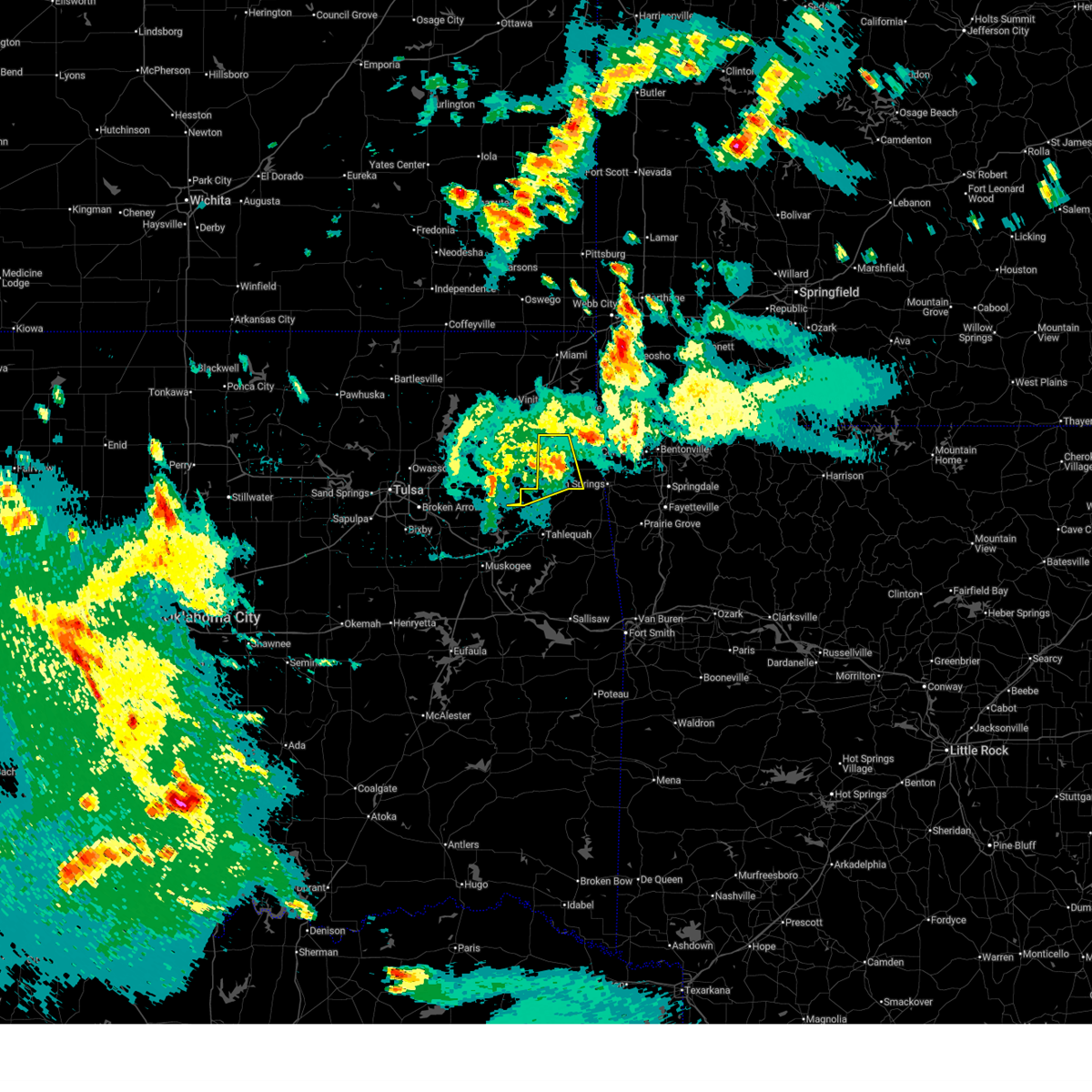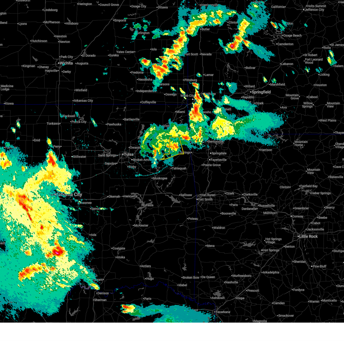 At 1237 am cdt, severe thunderstorms were located along a line extending from jay to tahlequah to 8 miles north of enterprise, and moving northeast at 50 mph (radar indicated). Hazards include 70 mph wind gusts and penny size hail. Expect considerable tree damage. damage is likely to mobile homes, roofs and outbuildings. locations in or near the path include, kansas, lake eucha state park, eldon, proctor, briartown, porum, colcord, cherokee landing state park, natural falls state park, webbers falls, lake tenkiller state park, gore, maysville, cookson, christie, cherokee city, west siloam springs, ballard, sulphur springs, watts, siloam springs, box, gravette, lake francis, westville, baron, gentry, decatur, cincinnati, fairmount, springtown, marietta, gallitin, vian, hiwasse, summers, bunch, highfill, wedington, adair state park, stilwell, northwest arkansas regional airport, prairie grove battlefield state park, brushy lake state park, oak grove, elm springs, tontitown, wheeler, savoy, viney grove, rhea, canehill, clyde, morrow, farmington, prairie grove, lincoln, bella vista, centerton, vaughn, cave springs, healing springs, bentonville, harmon, walnut grove, miller, rocky comfort, marble city, brushy, mc key and sallisaw this includes interstate 40 in oklahoma between mile markers 267 and 309. 0. 75in.