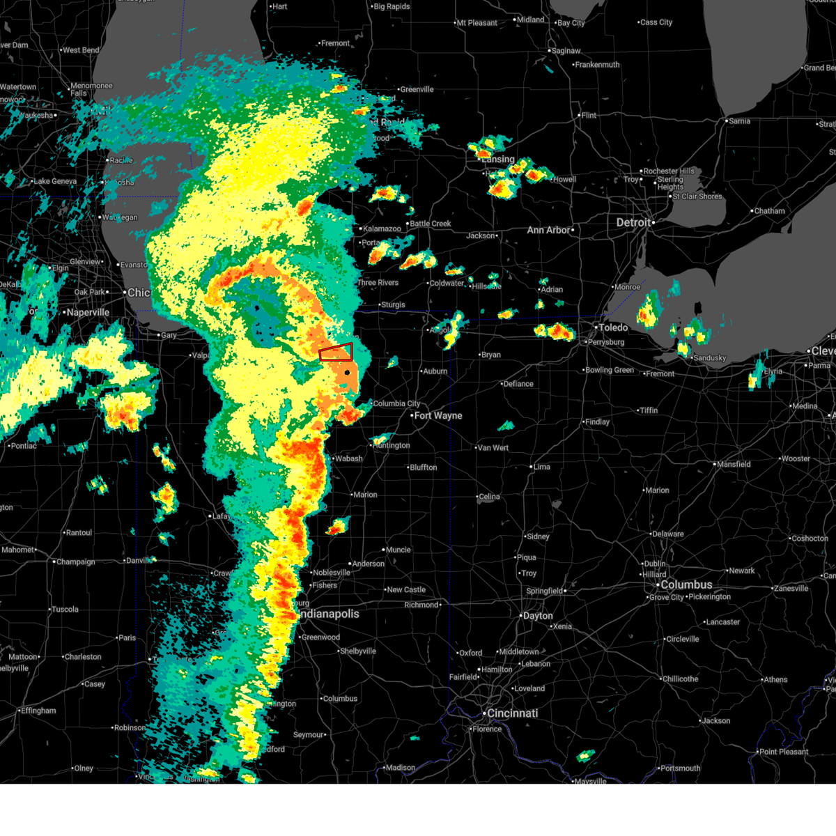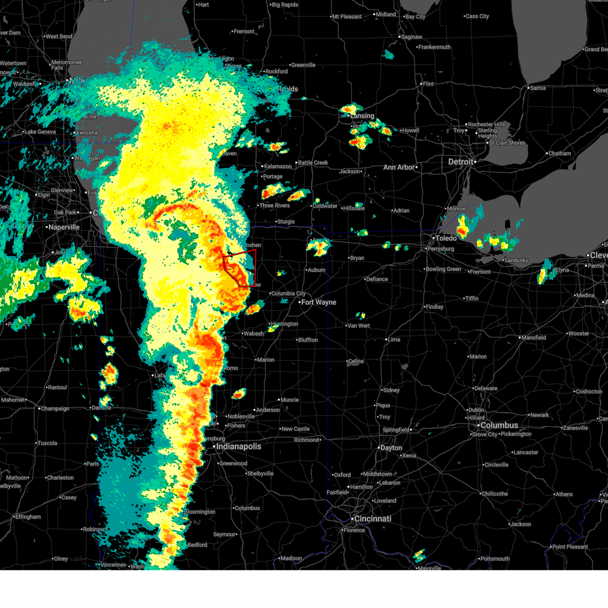 At 1234 am edt, severe thunderstorms were located along a line extending from near middlebury to near millersburg to north webster to pierceton, moving northeast at 55 mph (radar indicated). Hazards include 70 mph wind gusts. Expect considerable tree damage. damage is likely to mobile homes, roofs, and outbuildings. these severe storms will be near, ligonier, white pigeon, and topeka around 1240 am edt. sturgis, lagrange, tri-lakes, albion, and rome city around 1245 am edt. kendallville around 1255 am edt. other locations impacted by these severe thunderstorms include honeyville, blue lake, klinger lake, larwill, big long lake, lake wawasee, howe, plato, little chapman lake, and mongo. This includes interstate 80 in indiana between mile markers 97 and 132.