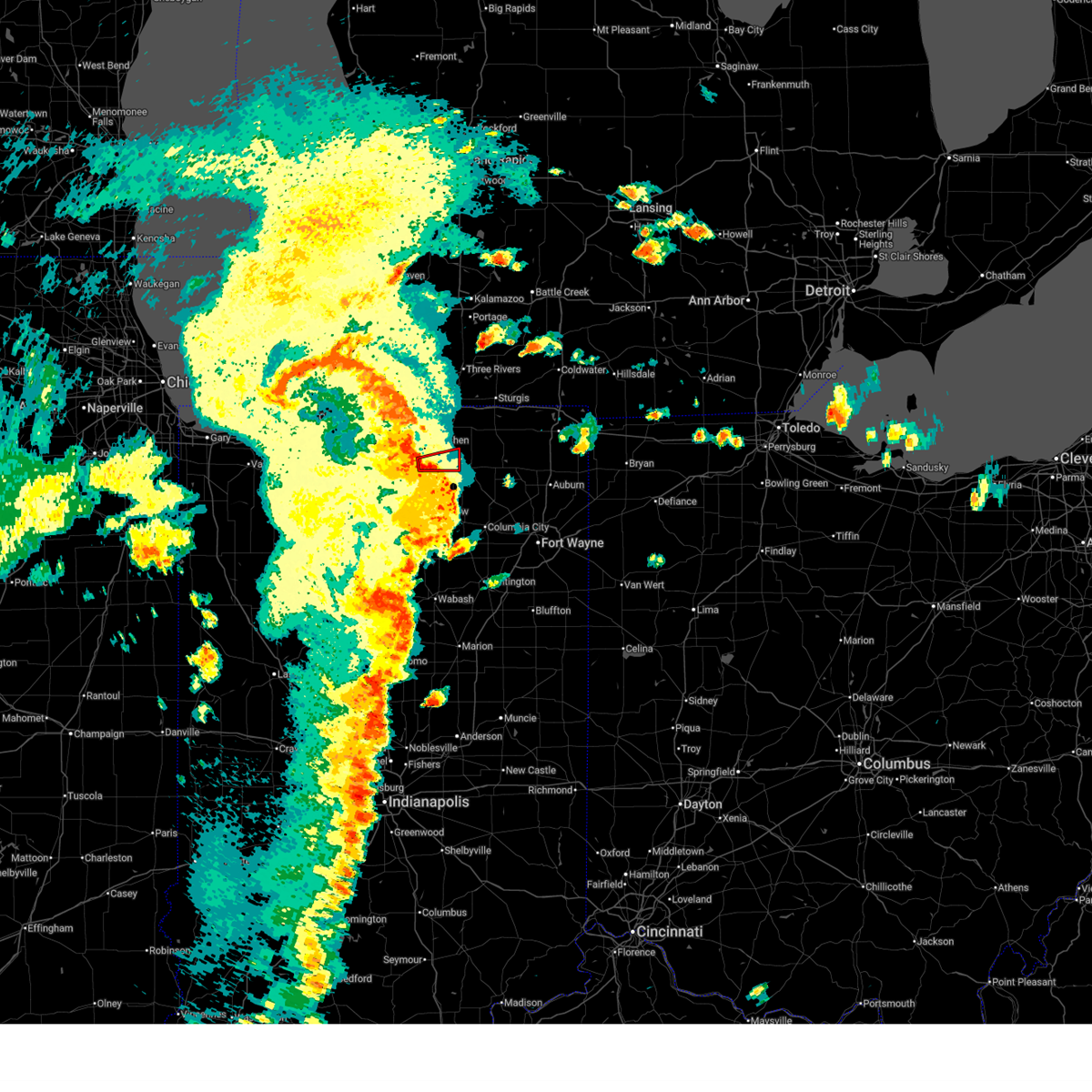 Svriwx the national weather service in northern indiana has issued a * severe thunderstorm warning for, eastern elkhart county in north central indiana, noble county in northeastern indiana, whitley county in northeastern indiana, kosciusko county in north central indiana, lagrange county in northeastern indiana, southern st. joseph county in southwestern michigan, southwestern branch county in southwestern michigan, * until 100 am edt. * at 1212 am edt, severe thunderstorms were located along a line extending from near osceola to near nappanee to near mentone to near akron, moving northeast at 55 mph (radar indicated). Hazards include 70 mph wind gusts. Expect considerable tree damage. damage is likely to mobile homes, roofs, and outbuildings. severe thunderstorms will be near, goshen, warsaw, winona lake, dunlap, milford, and new paris around 1220 am edt. syracuse, middlebury, bristol, north webster, and millersburg around 1225 am edt. pierceton around 1230 am edt. ligonier, white pigeon, and topeka around 1235 am edt. sturgis, lagrange, tri-lakes, albion, and rome city around 1245 am edt. other locations impacted by these severe thunderstorms include honeyville, blue lake, klinger lake, larwill, big long lake, lake wawasee, howe, plato, little chapman lake, and mongo. This includes interstate 80 in indiana between mile markers 97 and 132.