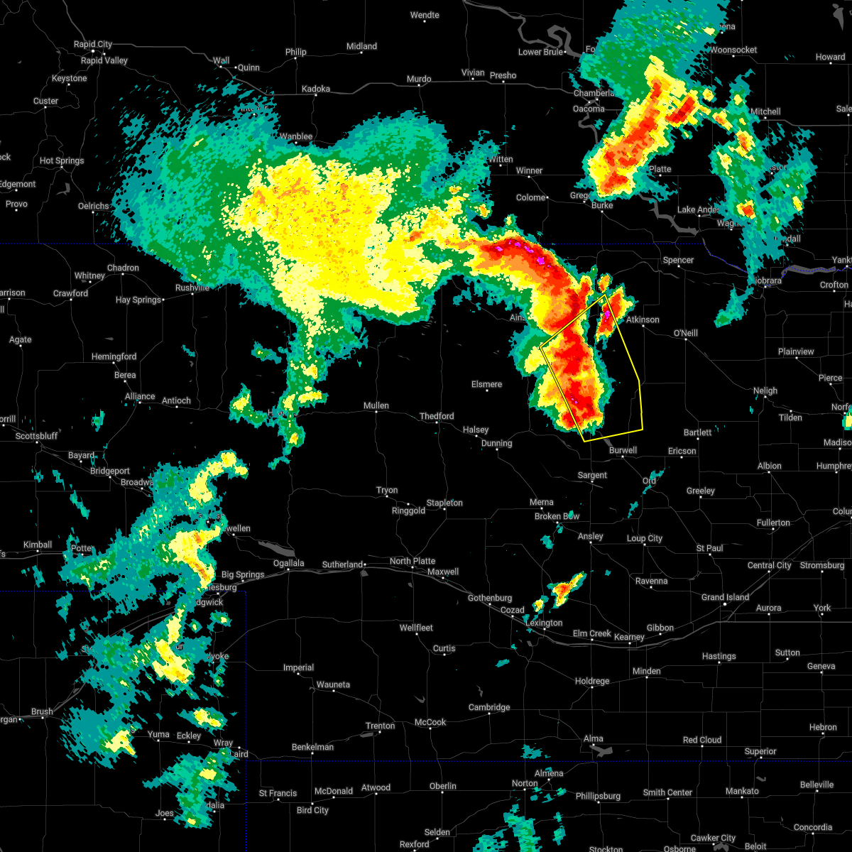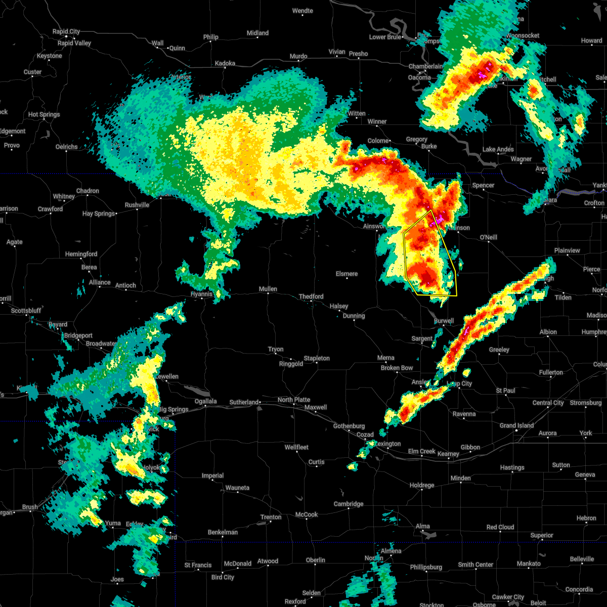 At 1104 pm cdt, severe thunderstorms were located along a line extending from butte to 6 miles north of atkinson to 14 miles south of newport, moving southeast at 35 mph (public. at 1054 pm 65 mph winds were reported 7 miles west southwest of butte). Hazards include 70 mph wind gusts and penny size hail. Expect considerable tree damage. damage is likely to mobile homes, roofs, and outbuildings. locations impacted include, ainsworth, bassett, spencer, springview, stuart, butte, long pine, newport, naper, johnstown, dustin, burton, anoka, bobcat state wildlife management area, twin lakes state wildlife management area, hull lake state wildlife management area, thomas creek state wildlife management area, mariaville, pine glen state wildlife refuge, and antelope peak. this includes the following highways, highway 183 between mile markers 163 and 223. highway 20 between mile markers 226 and 288. highway 281 between mile markers 214 and 223. Highway 12 near mile marker 40, and between mile markers 44 and 123.