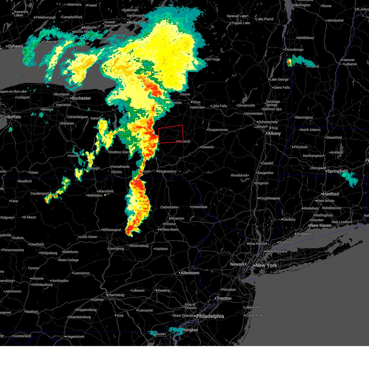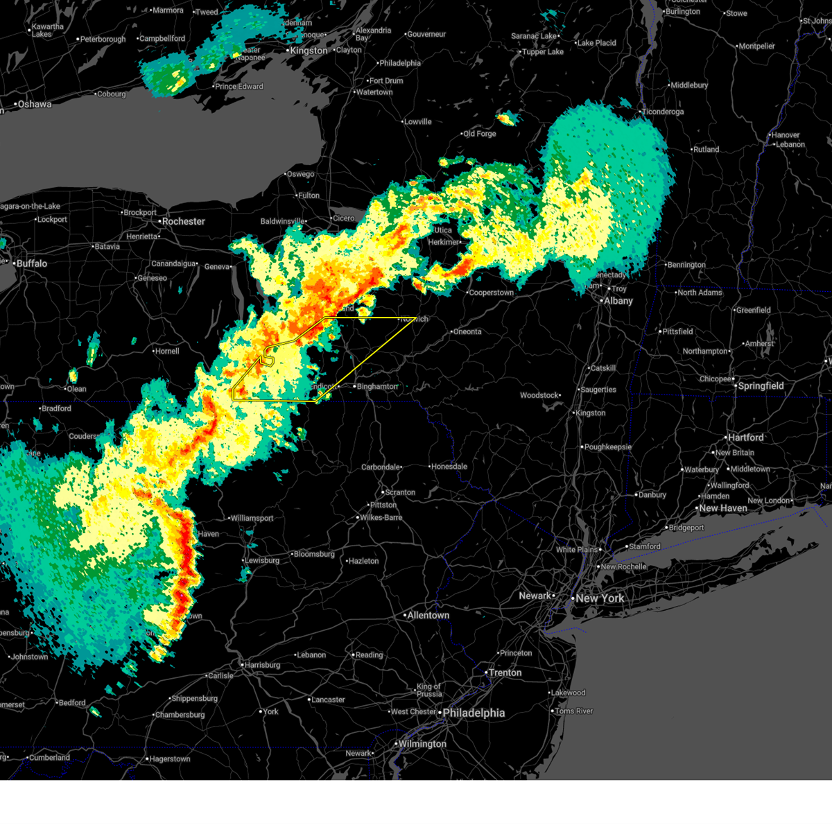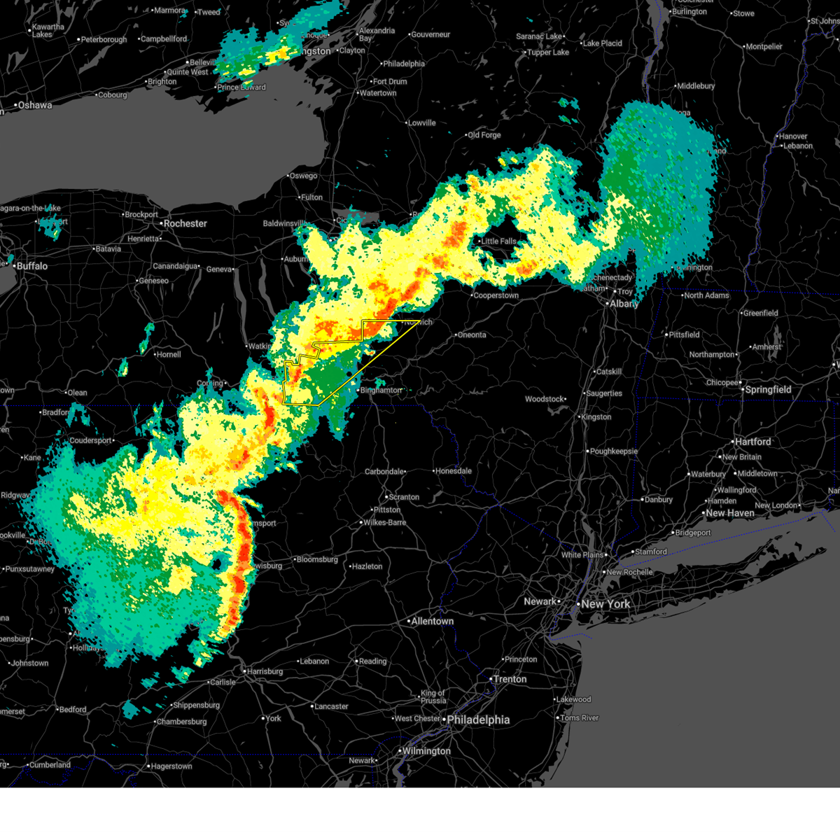 At 802 pm edt, severe thunderstorms were located along a line extending from near cedarville to plymouth to near hallstead, moving east at 60 mph (radar indicated). Hazards include 70 mph wind gusts. Expect considerable tree damage. damage is likely to mobile homes, roofs, and outbuildings. severe thunderstorms will be near, north norwich around 805 pm edt. sherburne around 810 pm edt. new berlin, columbus and windsor around 815 pm edt. sanford, edmeston and pittsfield around 820 pm edt. deposit and leonardsville around 825 pm edt. hartwick and exeter center around 830 pm edt. cooperstown, hyde park and richfield springs around 835 pm edt. walton and colchester around 840 pm edt. A tornado watch remains in effect until 1000 pm edt for central new york.