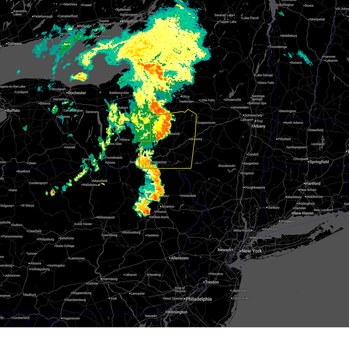 At 647 pm edt, severe thunderstorms were located along a line extending from near waterville to near earlville to near pitcher to near candor, moving southeast at 40 mph (radar indicated). Hazards include 60 mph wind gusts. Expect damage to trees, and power lines. these severe storms will be near, hamilton, waterville and lebanon around 650 pm edt. plymouth, sherburne and clayville around 655 pm edt. brookfield, north norwich and bridgewater around 700 pm edt. norwich, oxford and columbus around 705 pm edt. endicott, greater binghamton airport and vestal around 710 pm edt. johnson city, guilford and pittsfield around 715 pm edt. binghamton, richfield springs and mt upton around 720 pm edt. hartwick, morris and gilbertsville around 725 pm edt. a tornado watch remains in effect until 1000 pm edt for oneida county in central new york. A severe thunderstorm watch remains in effect until 900 pm edt for the remainder of central new york.