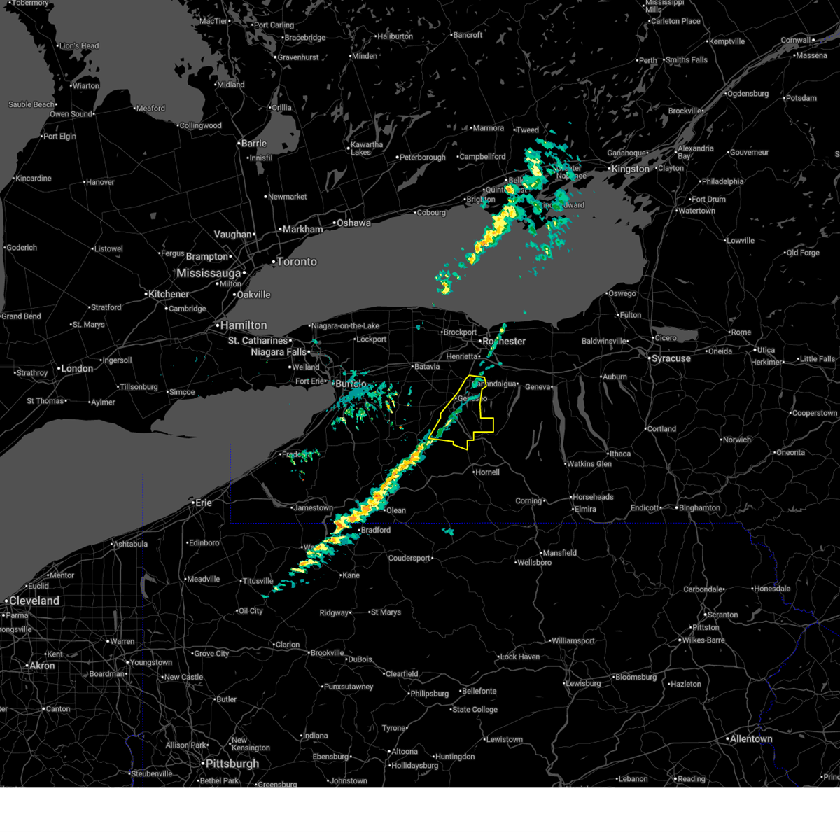 Svrbuf the national weather service in buffalo has issued a * severe thunderstorm warning for, south central wayne county in western new york, wyoming county in western new york, northeastern cattaraugus county in western new york, southeastern erie county in western new york, livingston county in western new york, northern allegany county in western new york, southeastern monroe county in western new york, ontario county in western new york, * until 645 pm edt. * at 541 pm edt, severe thunderstorms were located along a line extending from near ashford hollow to bloomfield, moving east at 65 mph (radar indicated). Hazards include 60 mph wind gusts and penny size hail. expect damage to roofs, siding, and trees