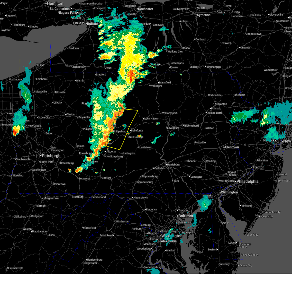 At 218 pm edt, severe thunderstorms were located along a line extending from near trout run to near mcelhattan to near zion to state college, moving east at 60 mph. these are very dangerous storms (radar indicated). Hazards include 70 to 80 mph wind gusts. Flying debris will be dangerous to those caught without shelter. mobile homes will be heavily damaged. expect considerable damage to roofs, windows, and vehicles. extensive tree damage and power outages are likely. locations impacted include, state college, lock haven, bellefonte, jersey shore, waterville, flemington, ramblewood, zion, pine grove mills and madisonburg. The fastest winds appear to be moving through lamar and spring mills.