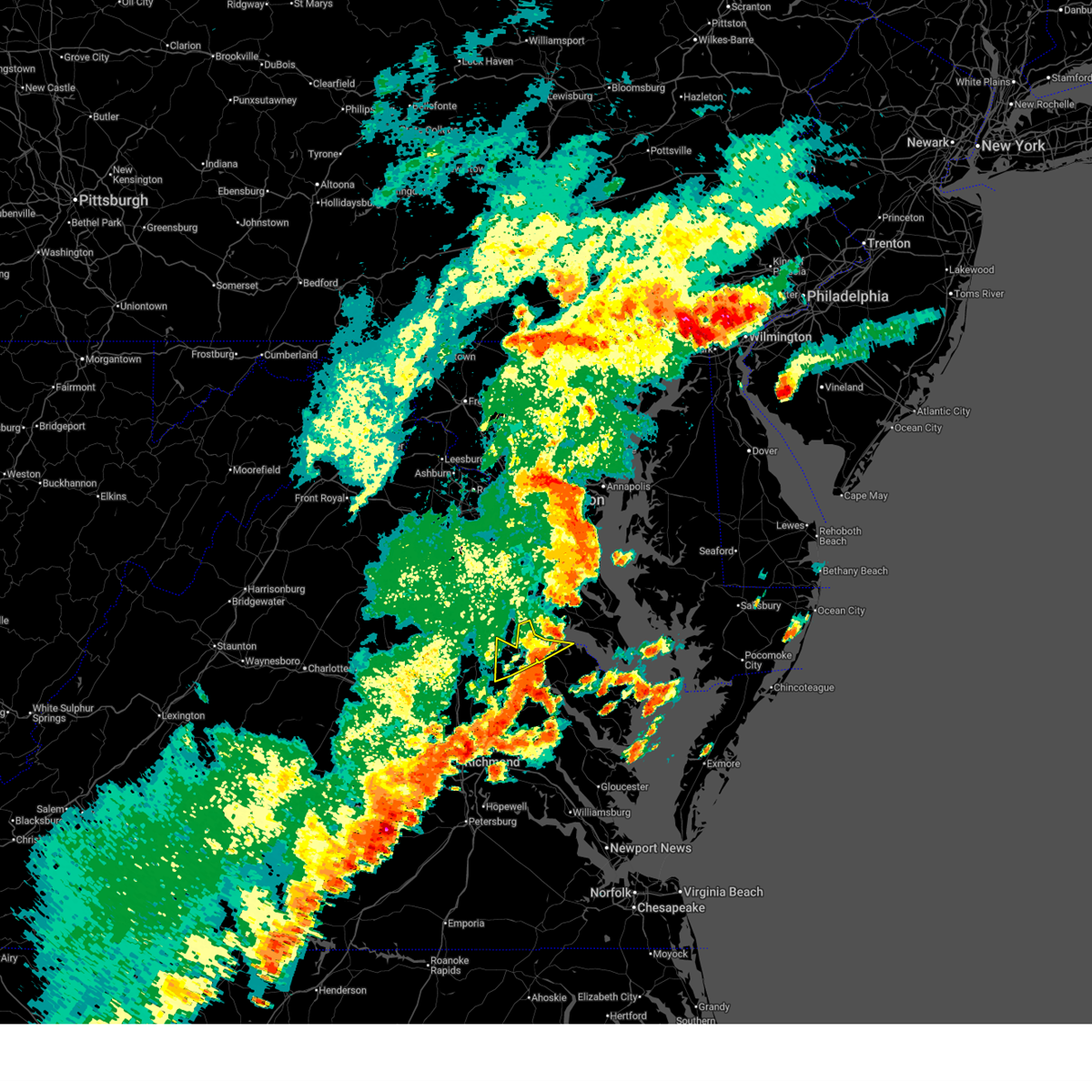 At 439 pm est, severe thunderstorms were located along a line extending from near goochland to near amelia courthouse to near crewe, moving northeast at 60 mph (radar indicated). Hazards include 60 mph wind gusts. Expect damage to trees and powerlines. severe thunderstorms will be near, powhatan, goochland, crewe, amelia courthouse, scotts fork, chula, and macon around 445 pm est. oilville and sabot around 450 pm est. moseley, montpelier, and manakin around 455 pm est. tuckahoe and wyndham around 500 pm est. richmond and bon air around 505 pm est. ashland, randolph macon college, laurel, ladysmith, lakeside, and glen allen around 510 pm est. university of richmond and kings dominion around 515 pm est. bowling green, virginia union university, mechanicsville, milford, downtown richmond, hanover, and dawn around 520 pm est. other locations impacted by these severe thunderstorms include chilesburg, maidens, gum tree, etna mills, pocahontas state park, skinquarter, beach, chamberlayne, fine creek mills, and michaux. hail threat, radar indicated max hail size, <. 75 in wind threat, radar indicated max wind gust, 60 mph.