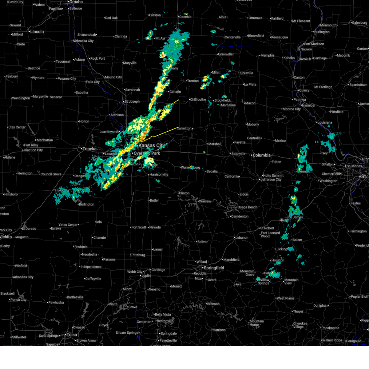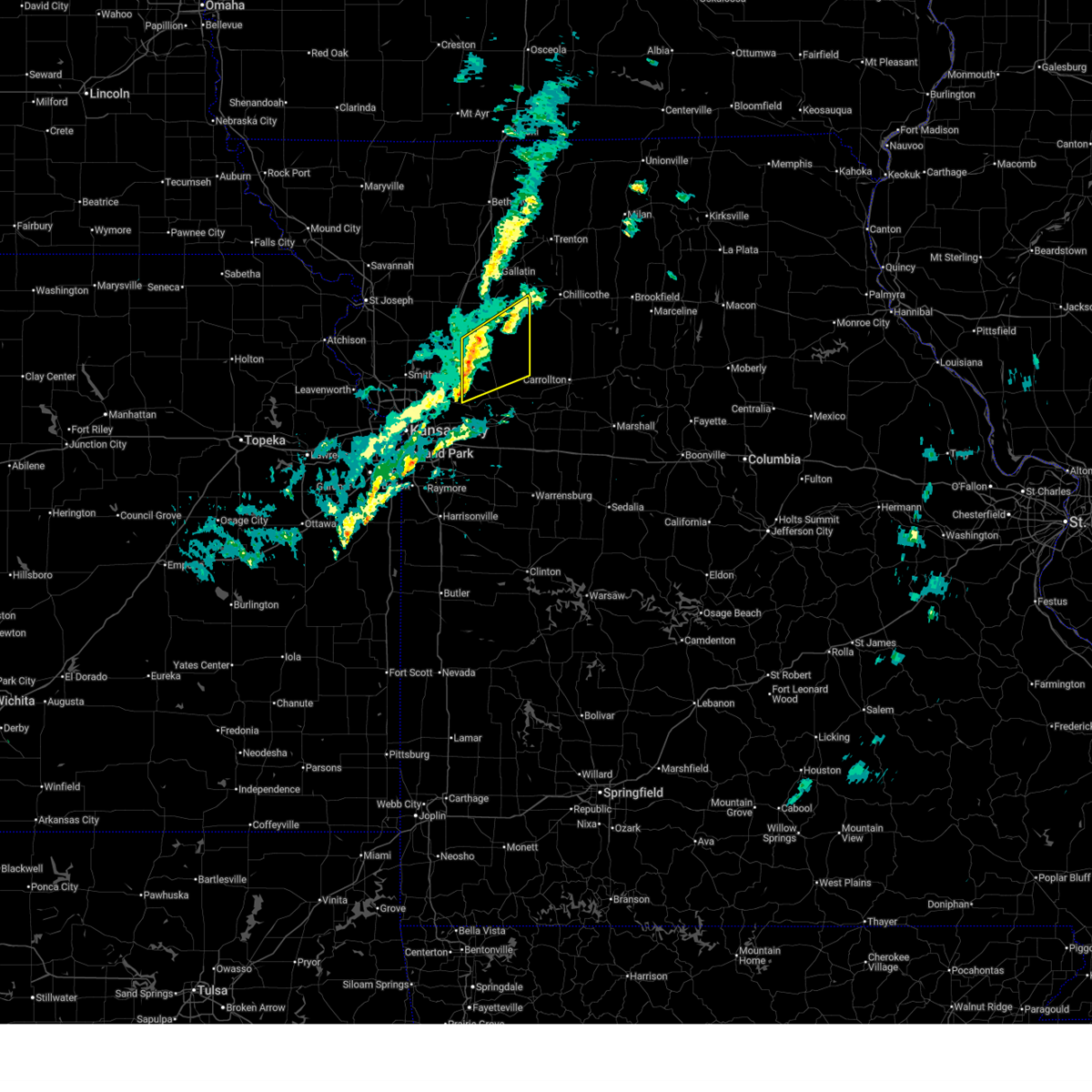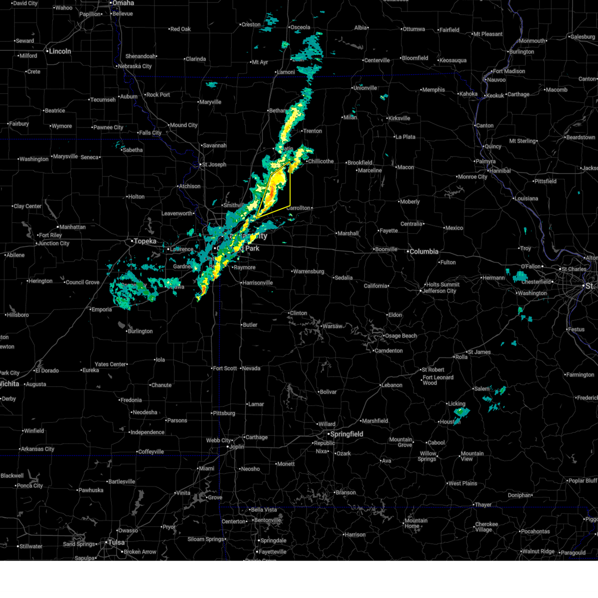 At 1128 pm cdt, a severe thunderstorm capable of producing a tornado was located near orrick, and moving north at 45 mph (radar indicated rotation). Hazards include tornado. Flying debris will be dangerous to those caught without shelter. mobile homes will be damaged or destroyed. damage to roofs, windows and vehicles will occur. tree damage is likely. locations impacted include, excelsior springs, lawson, woods heights, crystal lakes, excelsior estates, homestead, rayville, knoxville and elmira. Radar indicated.