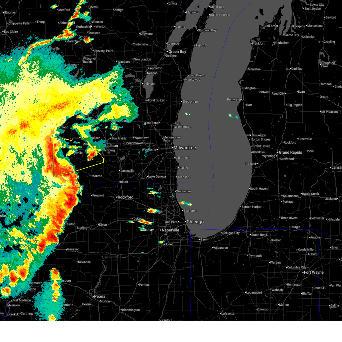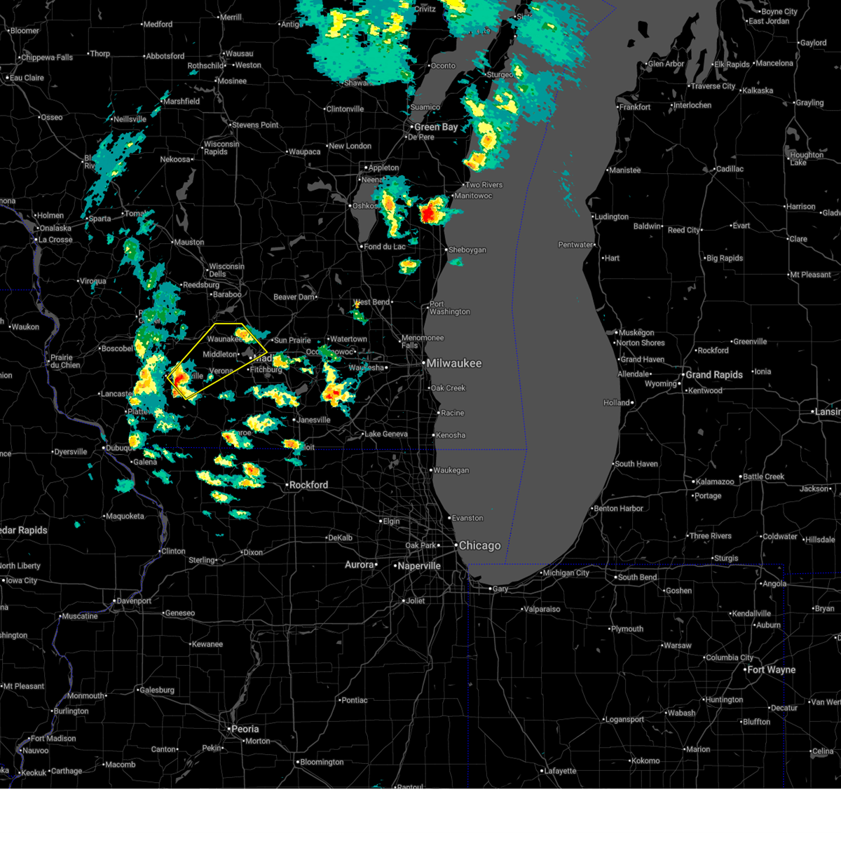 At 420 am cdt, severe thunderstorms were located along a line extending from near waterloo to deerfield to 7 miles north of belmont, moving southeast at 45 mph. at 334 am, lone rock reported a wind gust of 68 mph (radar indicated). Hazards include 70 mph wind gusts. Expect considerable tree damage. damage is likely to mobile homes, roofs and outbuildings. locations impacted include, madison, janesville, fitchburg, watertown, middleton, whitewater, hartford, stoughton, fort atkinson, monroe, verona, oregon, jefferson, mcfarland, monona, mount horeb, lake mills, milton, edgerton and mayville. People attending the jefferson county fair should seek safe shelter immediately!.