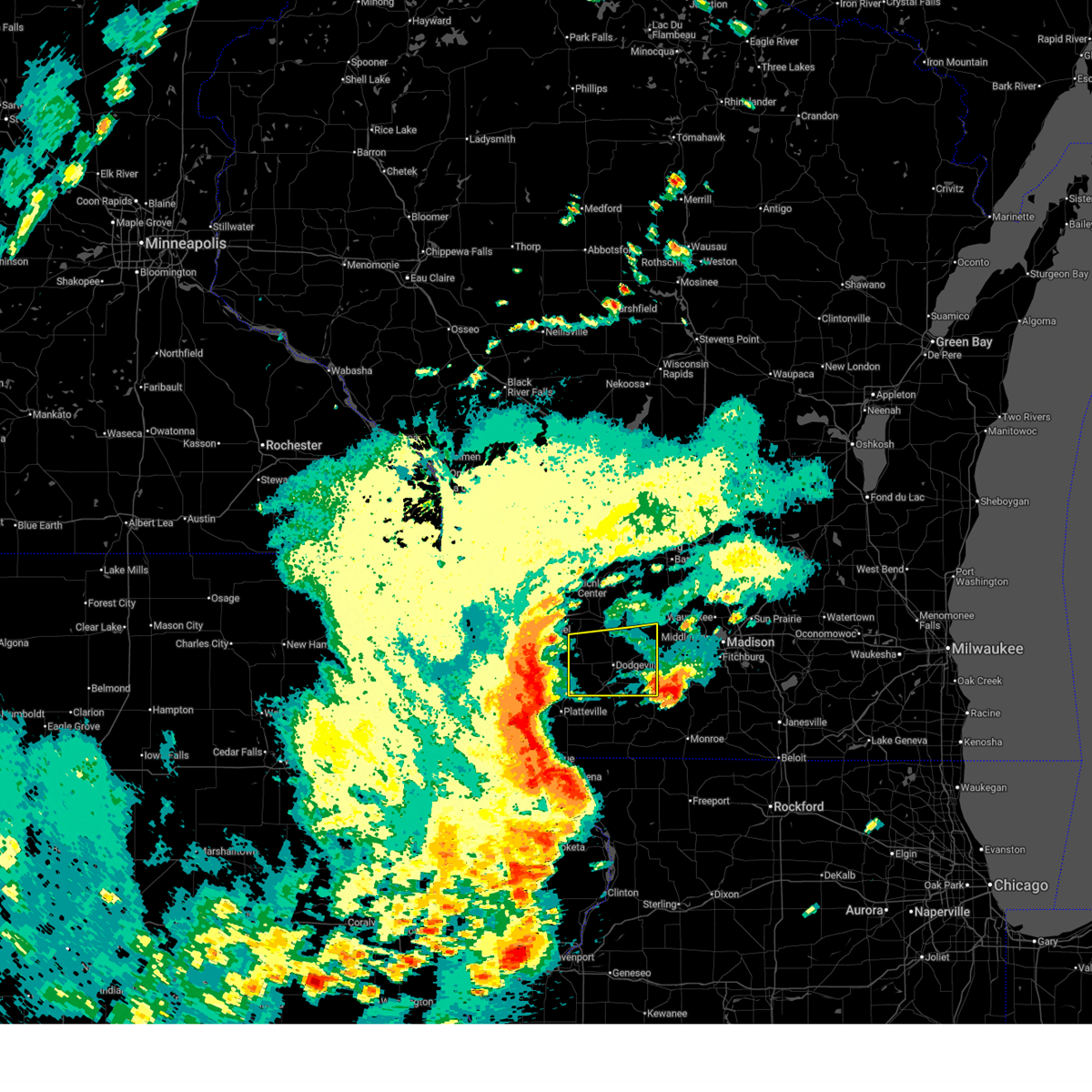 At 843 pm cdt, severe thunderstorms were located along a line extending from near dodgeville to near mineral point, moving east at 45 mph (trained weather spotters. at 841 pm, 64 mph winds were reported in darlington). Hazards include 70 mph wind gusts. Expect considerable tree damage. damage is likely to mobile homes, roofs, and outbuildings. Locations impacted include, dodgeville, mineral point, darlington, shullsburg, belmont, benton, argyle, blanchardville, somers, barneveld, wiota, highland, ridgeway, linden, new diggings, south wayne, cobb, lamont, rewey and hollandale.