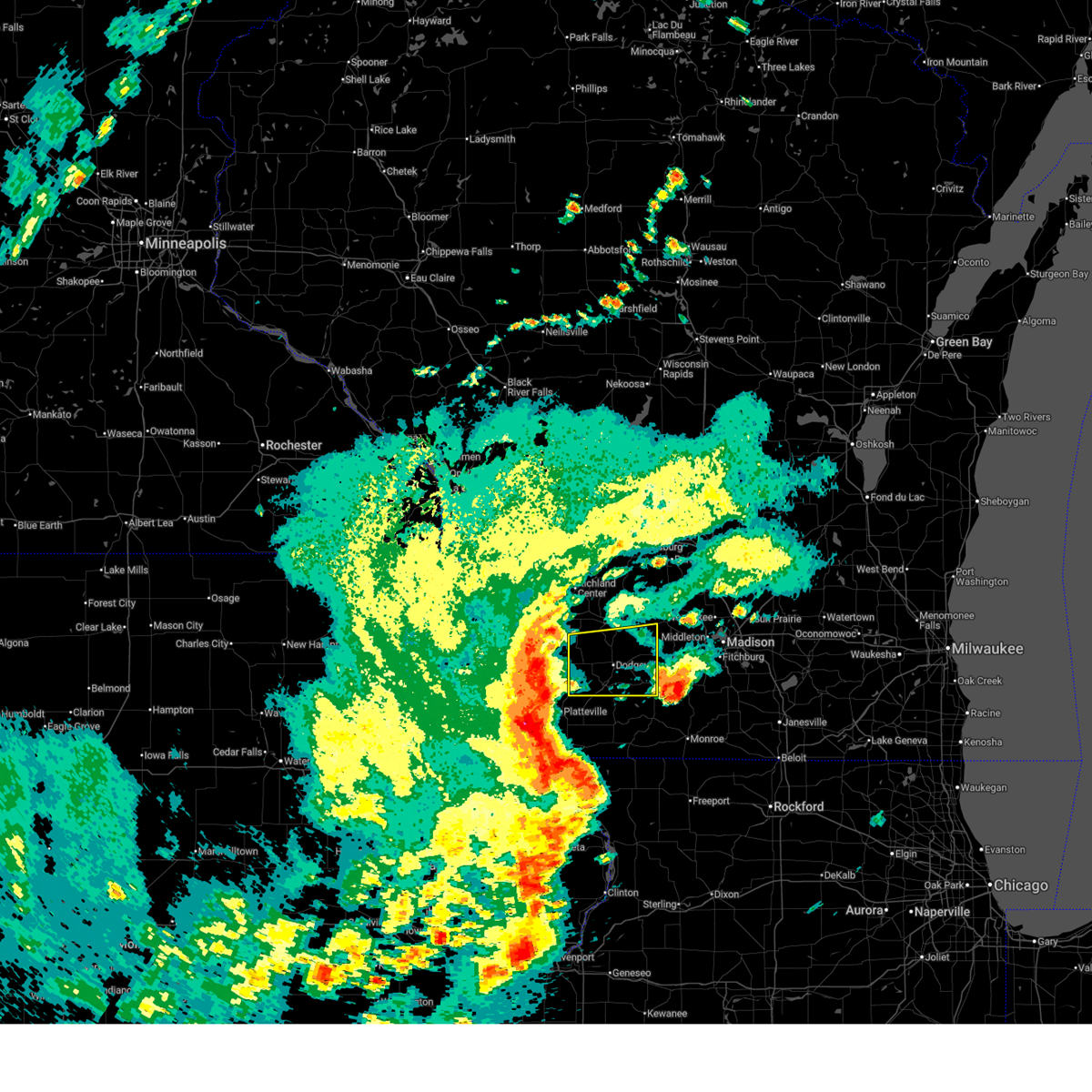 At 404 am cdt, severe thunderstorms were located along a line extending from near columbus to near sun prairie to 8 miles southeast of fennimore, moving southeast at 45 mph. at 334 am, a wind gust of 68 mph was reported at lone rock (radar indicated). Hazards include 70 mph wind gusts. Expect considerable tree damage. damage is likely to mobile homes, roofs and outbuildings. locations impacted include, madison, janesville, fitchburg, watertown, middleton, whitewater, hartford, stoughton, fort atkinson, monroe, verona, oregon, jefferson, mcfarland, monona, mount horeb, lake mills, milton, edgerton and mayville. People attending the jefferson county fair should seek safe shelter immediately!.