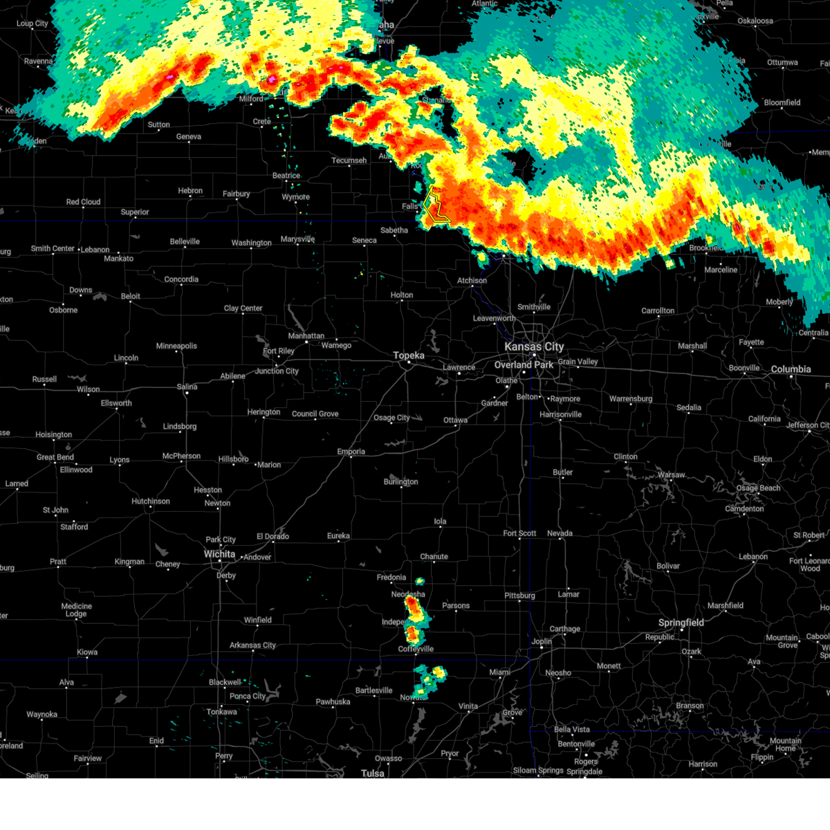 At 723 pm cdt, a severe thunderstorm capable of producing a tornado was located over rulo, or 7 miles east of falls city, moving northeast at 20 mph (radar indicated rotation). Hazards include tornado and quarter size hail. Flying debris will be dangerous to those caught without shelter. mobile homes will be damaged or destroyed. damage to roofs, windows, and vehicles will occur. tree damage is likely. This tornadic thunderstorm will remain over mainly rural areas of southeastern richardson county, including the following locations, preston, sac and fox nation reservation and iowa reservation of kansas and nebraska.