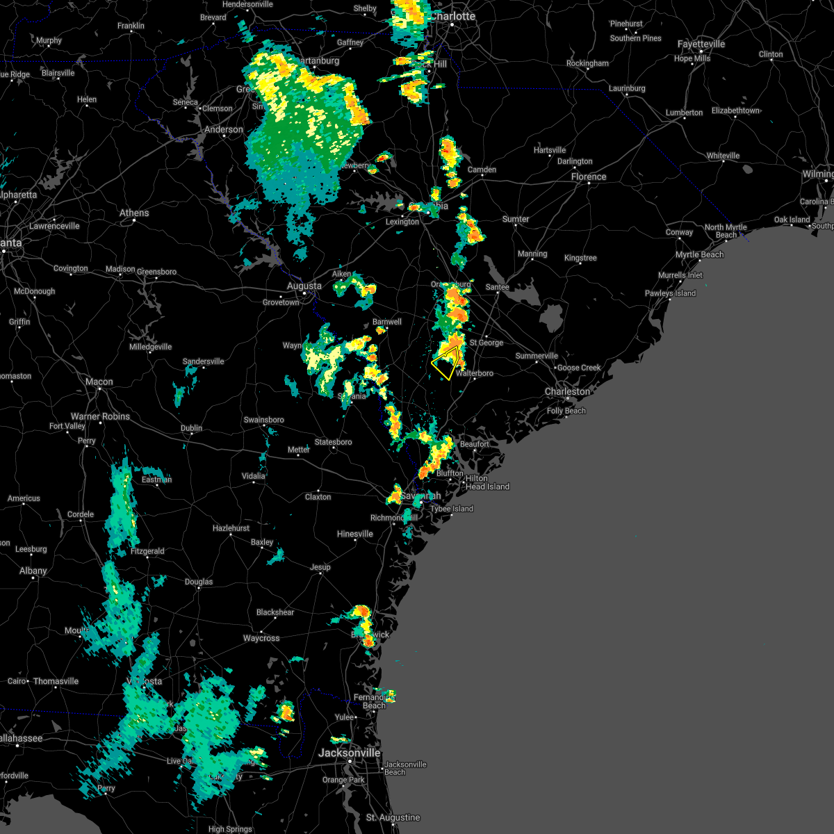 At 631 pm edt, a severe thunderstorm was located near walterboro, and is nearly stationary (radar indicated. this storm has a history of producing wind damage near walterboro). Hazards include 60 mph wind gusts and quarter size hail. Hail damage to vehicles is expected. expect wind damage to roofs, siding and trees. Locations impacted include, walterboro.