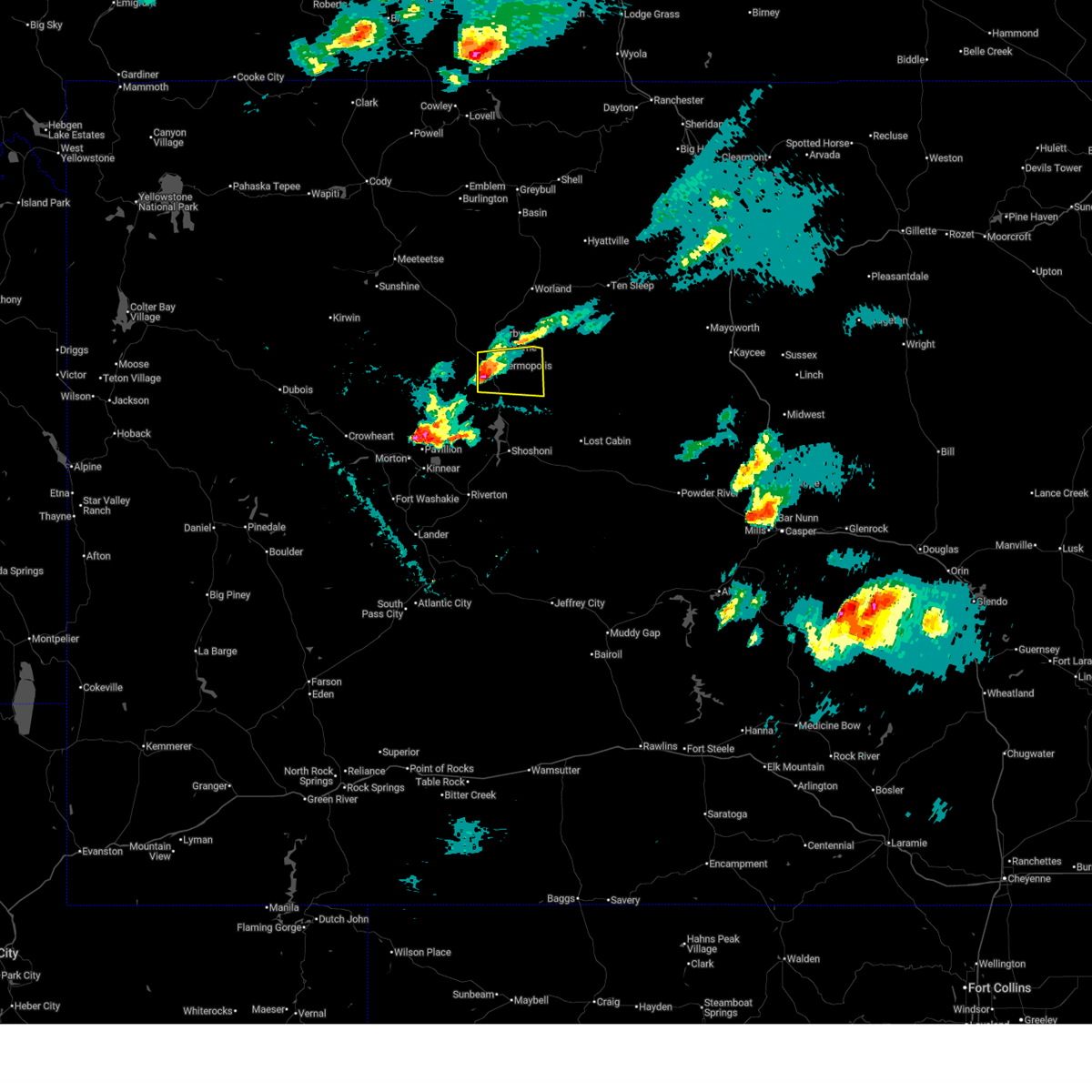 At 310 pm mdt, a severe thunderstorm was located 9 miles west of kirby, which is 12 miles northwest of thermopolis, moving east at 30 mph (radar indicated). Hazards include 60 mph wind gusts and quarter size hail. Hail damage to vehicles is expected. expect wind damage to roofs, siding and trees. this severe storm will be near, lucerne, kirby, winchester and the northern outskirts of thermopolis around 330 pm mdt. this storm has also shown increasing rotation so be alert for the possibility of a developing funnel cloud.