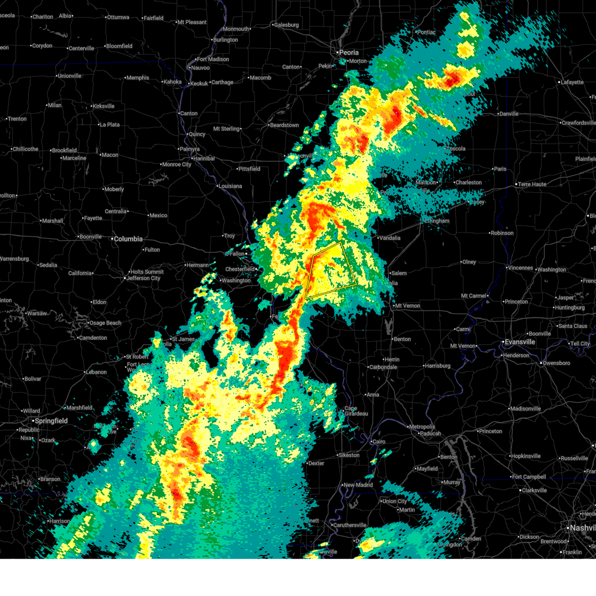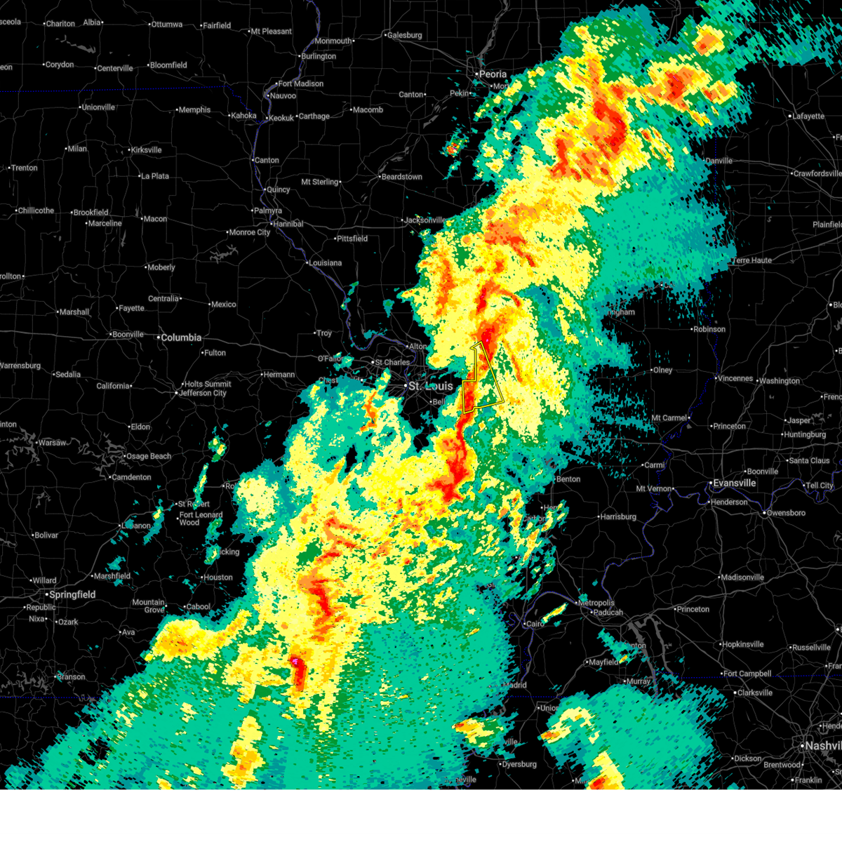 At 530 am cdt, severe thunderstorms were located along a line extending from old kane to near freeburg, moving northeast at 55 mph. these are very dangerous storms (radar indicated). Hazards include 80 mph wind gusts. Flying debris will be dangerous to those caught without shelter. mobile homes will be heavily damaged. expect considerable damage to roofs, windows, and vehicles. extensive tree damage and power outages are likely. locations impacted include, st. louis, belleville, granite city, o`fallon, alton, east st. louis, collinsville, edwardsville, godfrey, fairview heights, cahokia, swansea, glen carbon, shiloh, wood river, highland, troy, columbia, bethalto and jerseyville. this also includes horseshoe lake state park. this includes the following highways, interstate 70 in illinois between exits 21 and 30. interstate 55 in illinois between exits 23 and 37. Interstate 64 in illinois between exits 9 and 27.