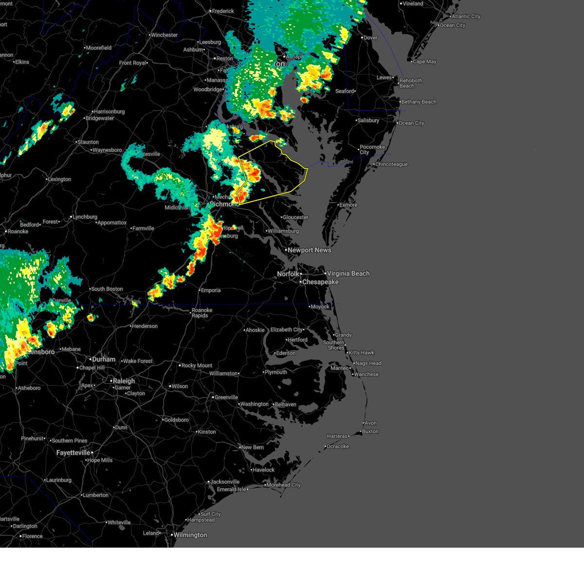 At 827 pm edt, severe thunderstorms were located along a line extending from near center cross to new kent, moving east at 45 mph (radar indicated). Hazards include 60 mph wind gusts. Expect damage to trees and powerlines. these severe storms will be near, center cross around 835 pm edt. west point and jamaica around 840 pm edt. morattico and shacklefords around 845 pm edt. lancaster, glenns and saluda around 855 pm edt. Other locations impacted by these severe thunderstorms include eltham, bertrand, cohoke, belle isle state park, sandston, rose garden, mattaponi, crouch, mascot and cooke.