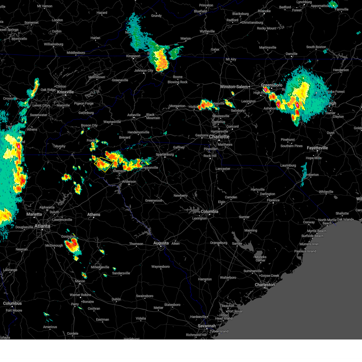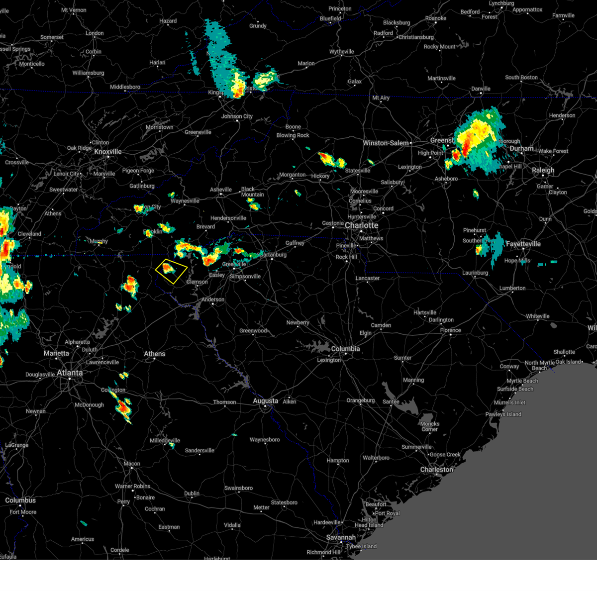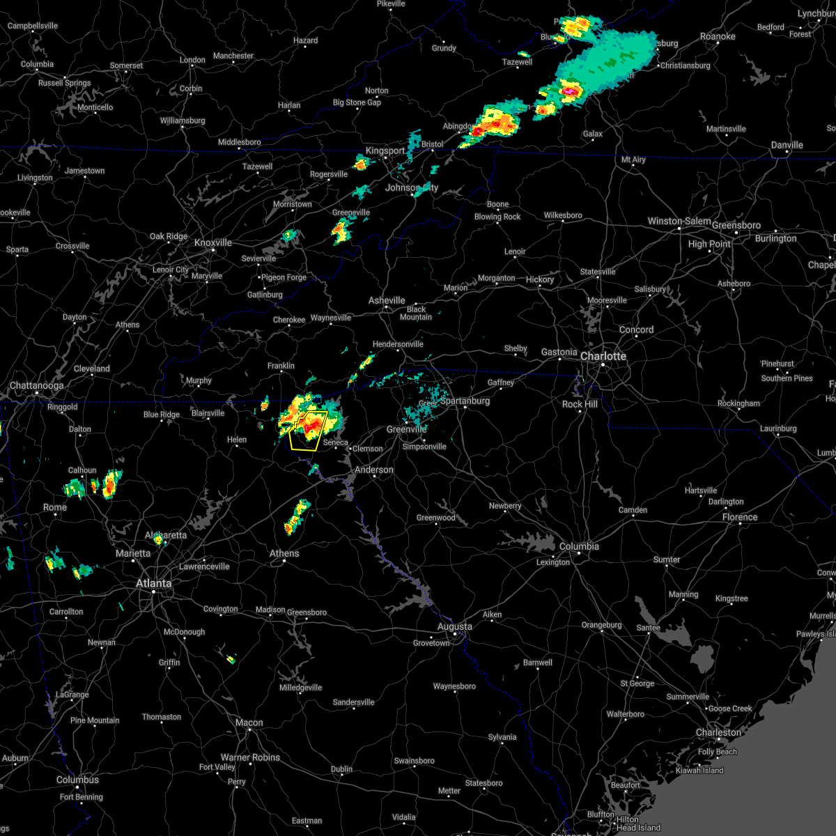At 720 pm edt, doppler radar indicated a line of severe thunderstorms capable of producing damaging winds in excess of 60 mph. these storms were located along a line extending from 8 miles north of walhalla to 5 miles north of clemson, moving north at 25 mph. penny size hail may also accompany the damaging winds. locations impacted include, clemson, seneca, walhalla, pickens, central, norris, six mile, salem, lake keowee and keowee toxaway state park.