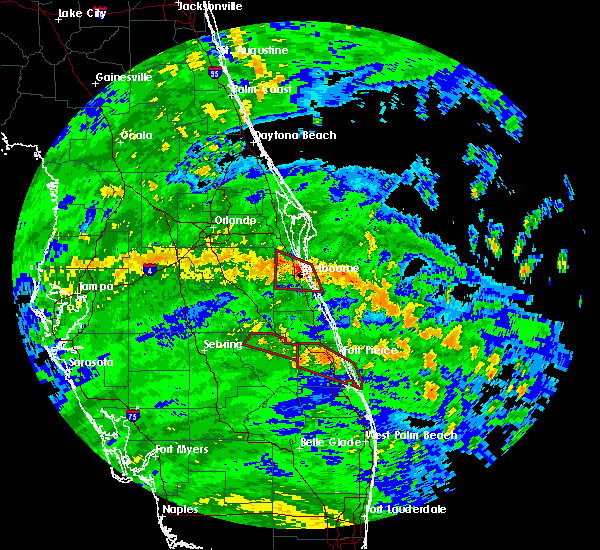 At 314 pm edt, a severe thunderstorm capable of producing a tornado was located over patrick air force base, moving northwest at 40 mph (radar indicated rotation). Hazards include tornado. Flying debris will be dangerous to those caught without shelter. mobile homes will be damaged or destroyed. damage to roofs, windows, and vehicles will occur. tree damage is likely. this dangerous storm will be near, viera around 320 pm edt. rockledge and cocoa around 330 pm edt. lone cabbage fish camp and canaveral groves around 340 pm edt. Other locations impacted by this tornadic thunderstorm include pineda.