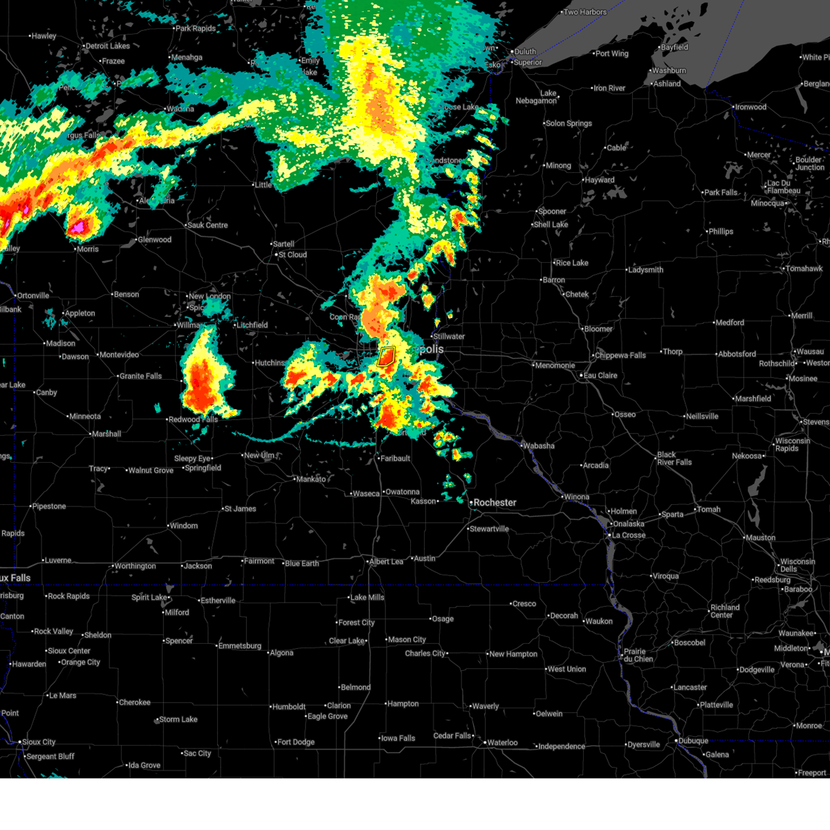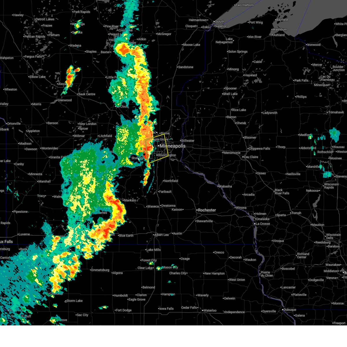 At 1251 am cdt, severe thunderstorms capable of producing a tornado were located along a line from over golden valley to over savage, or along a line from 5 miles west of minneapolis to 14 miles south of minneapolis, moving east at 35 mph (radar indicated rotation). Hazards include tornado. Flying debris will be dangerous to those caught without shelter. mobile homes will be damaged or destroyed. damage to roofs, windows and vehicles will occur. tree damage is likely. this tornado will be near, eden prairie, minnetonka and shakopee around 1235 am cdt. prior lake and bloomington around 1240 am cdt. edina around 1245 am cdt. st. louis park, savage and golden valley around 1250 am cdt. minneapolis, burnsville and richfield around 1255 am cdt. Other locations impacted by the tornado include south minneapolis, mall of america, fort snelling state park and univ of mn minneapolis campus.