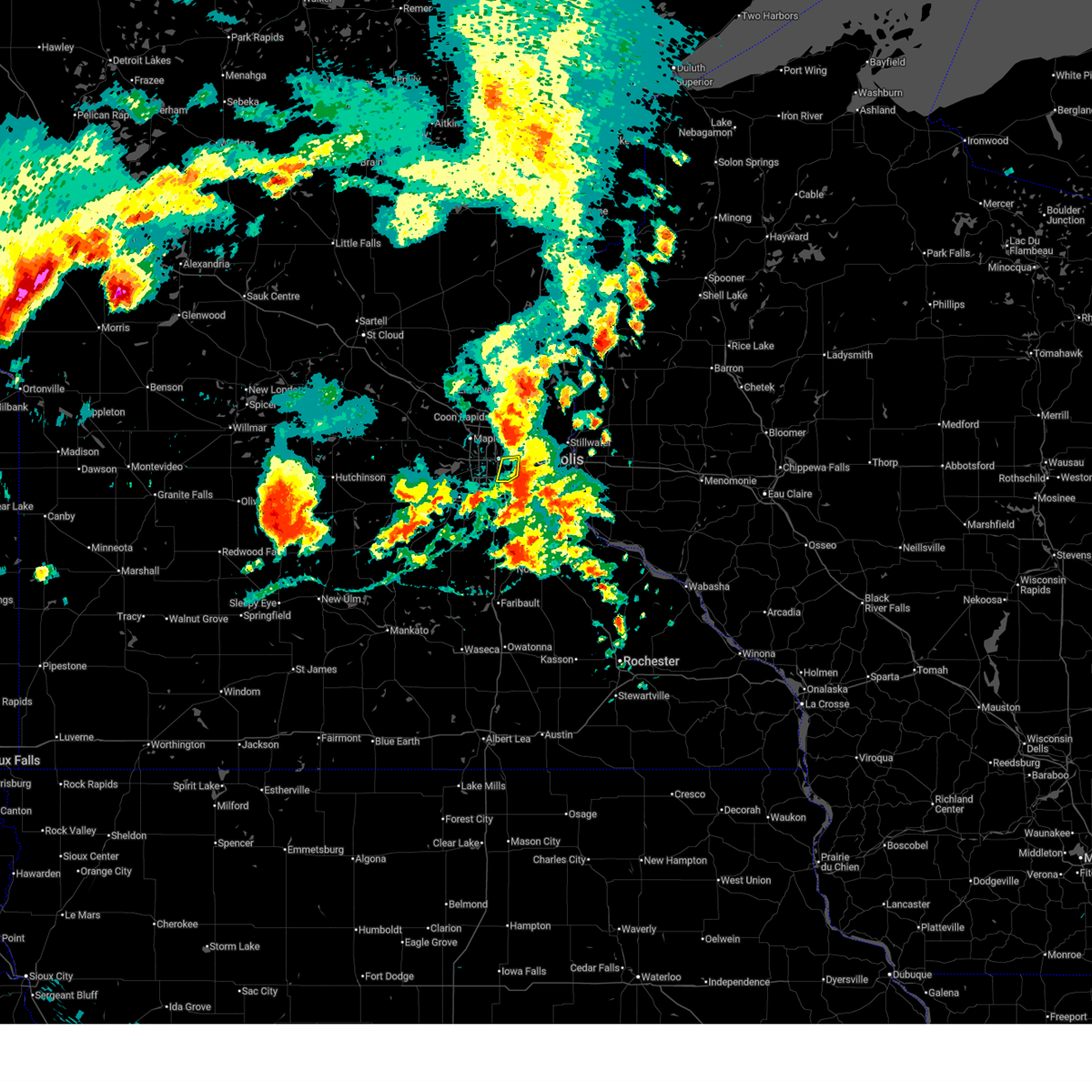 At 1002 pm cdt, severe thunderstorms were located along a line from near north hudson to near chaska, or along a line from 11 miles northwest of river falls to 19 miles southwest of minneapolis, moving south at 40 mph (radar indicated). Hazards include 70 mph wind gusts and small hail. Expect considerable tree damage. damage is likely to mobile homes, roofs, and outbuildings. locations impacted include, minneapolis, st. paul, bloomington, brooklyn park, plymouth, eagan, woodbury, maple grove, coon rapids, eden prairie, burnsville, blaine, lakeville, minnetonka, apple valley, edina, st. Louis park, maplewood, shakopee and richfield.